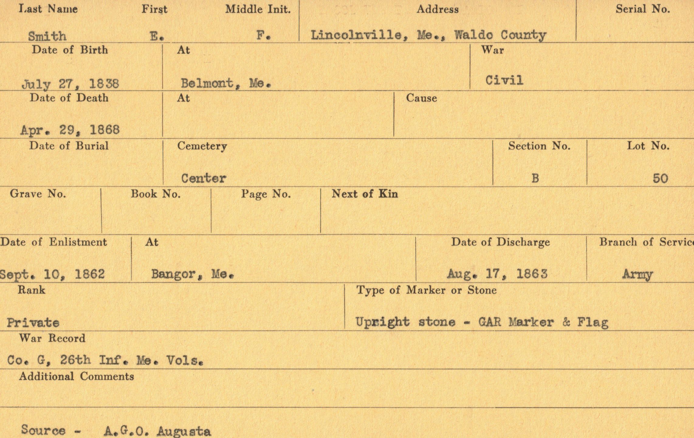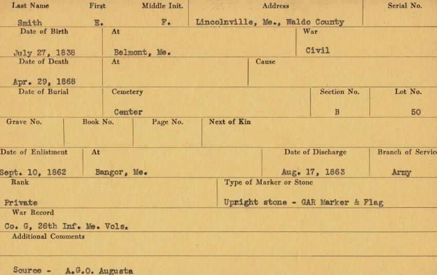 Military records of E. F. Smith who served in the Civil War.Relationships