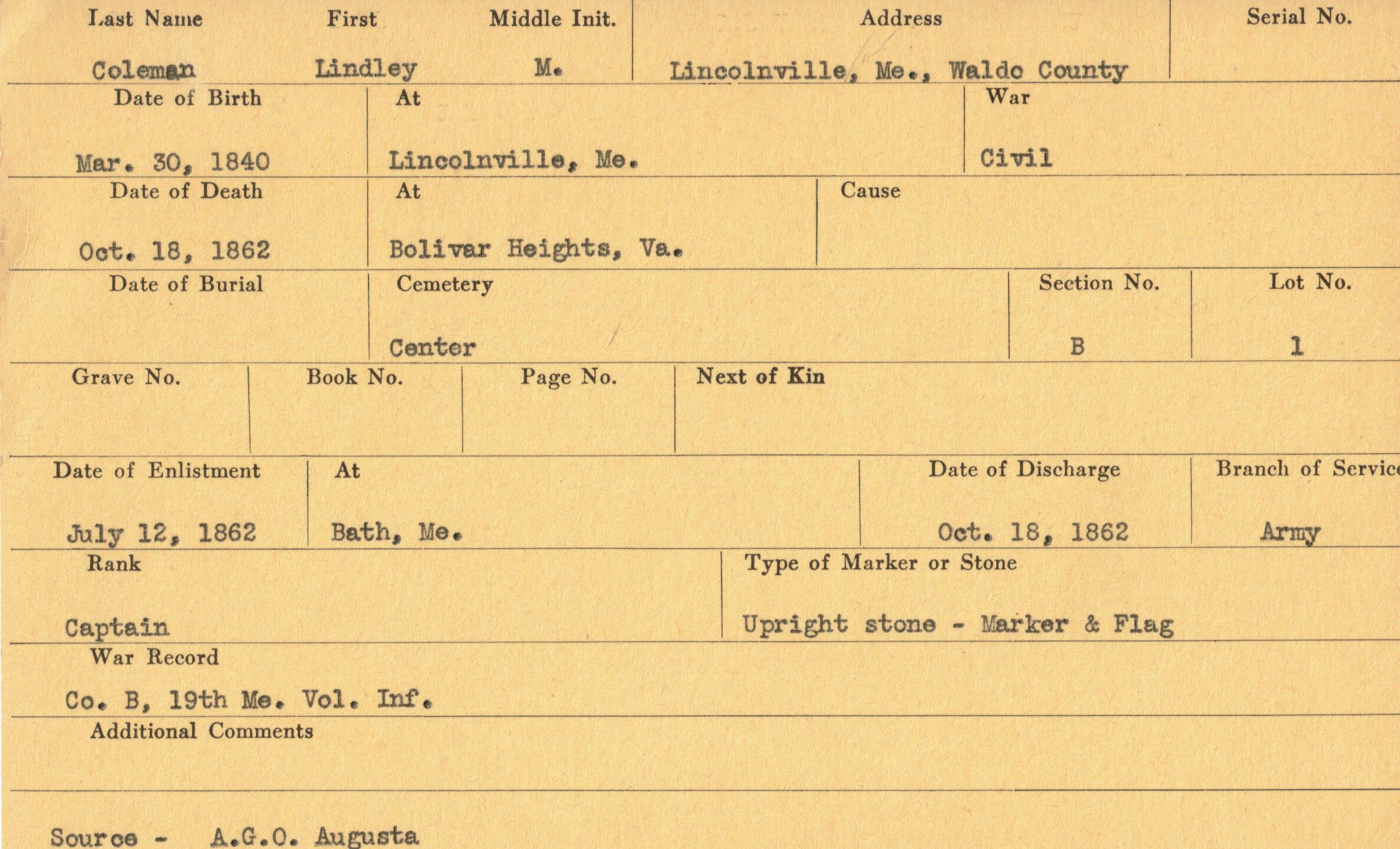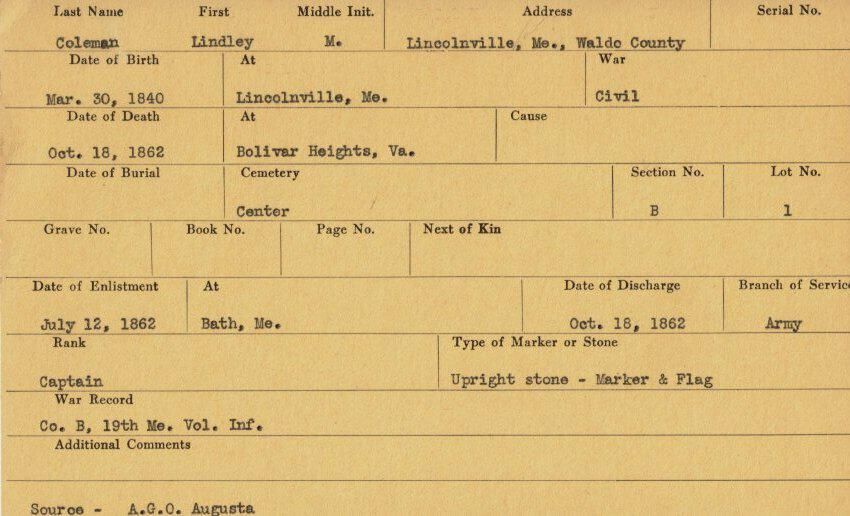 Military records of Lindley M. Coleman who served in the Civil War.Relationships