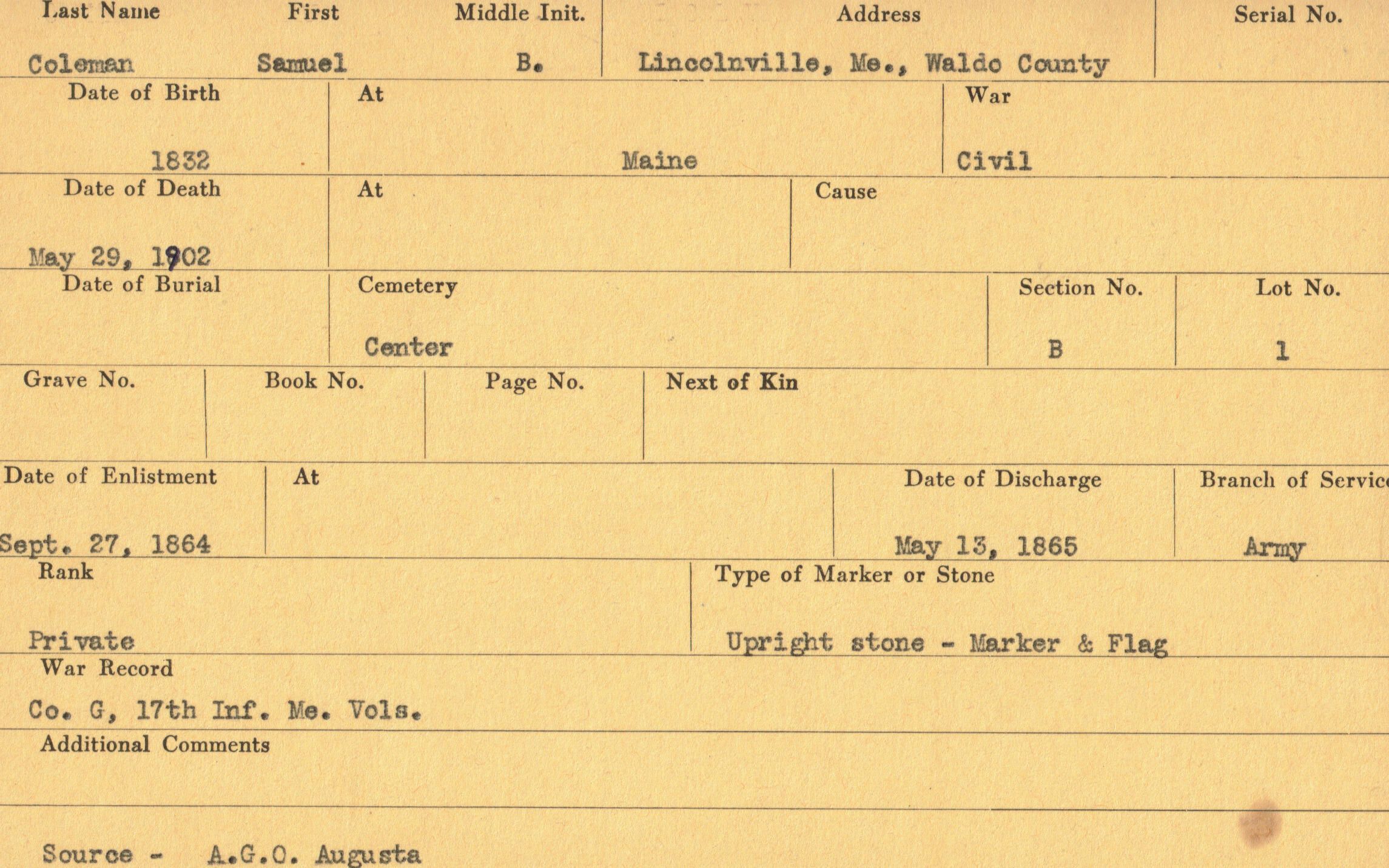 Military records of Samuel B. Coleman who served in the Civil War.Relationships