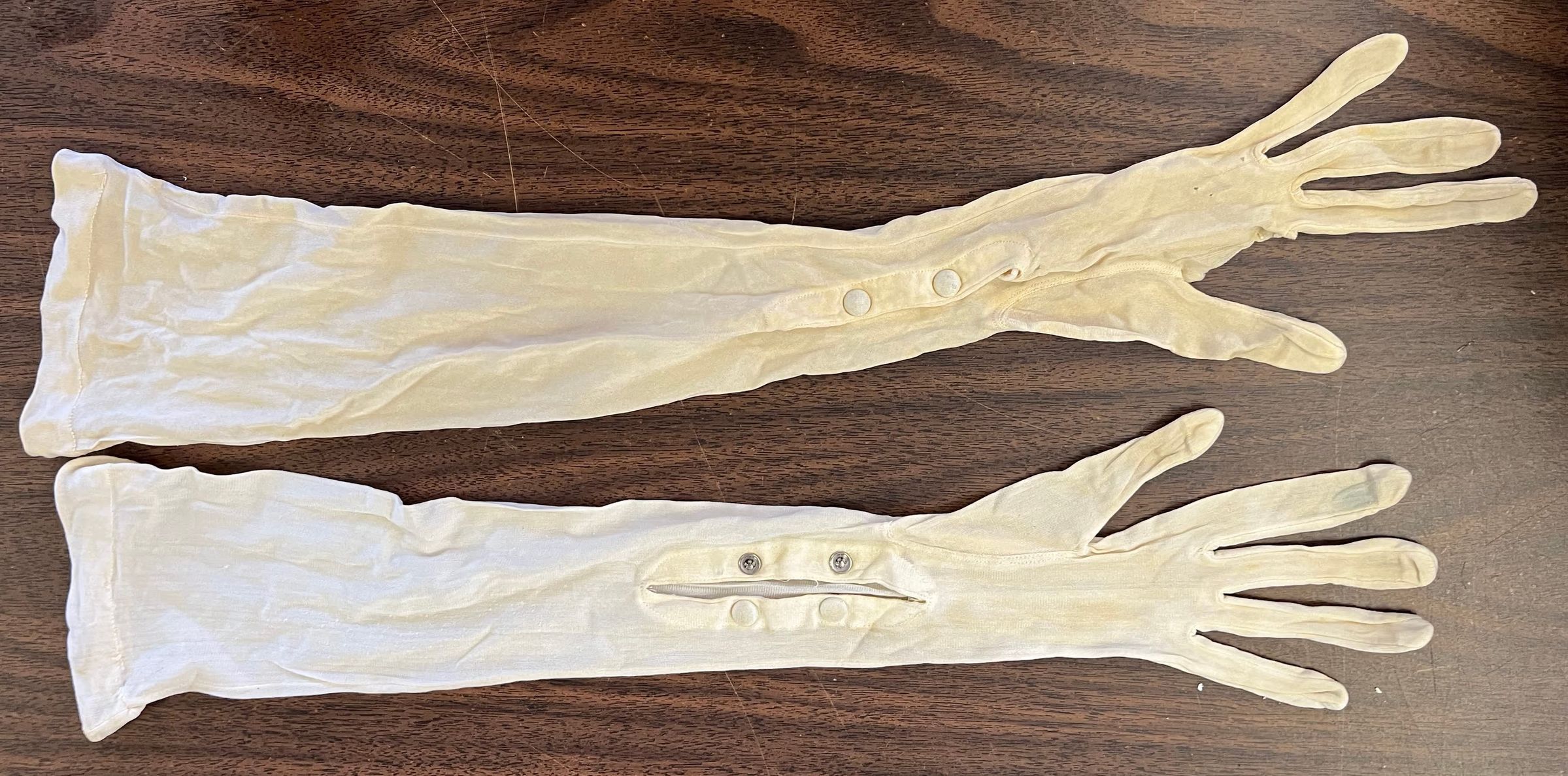 pair of long silk evening gloves with self-covered snaps