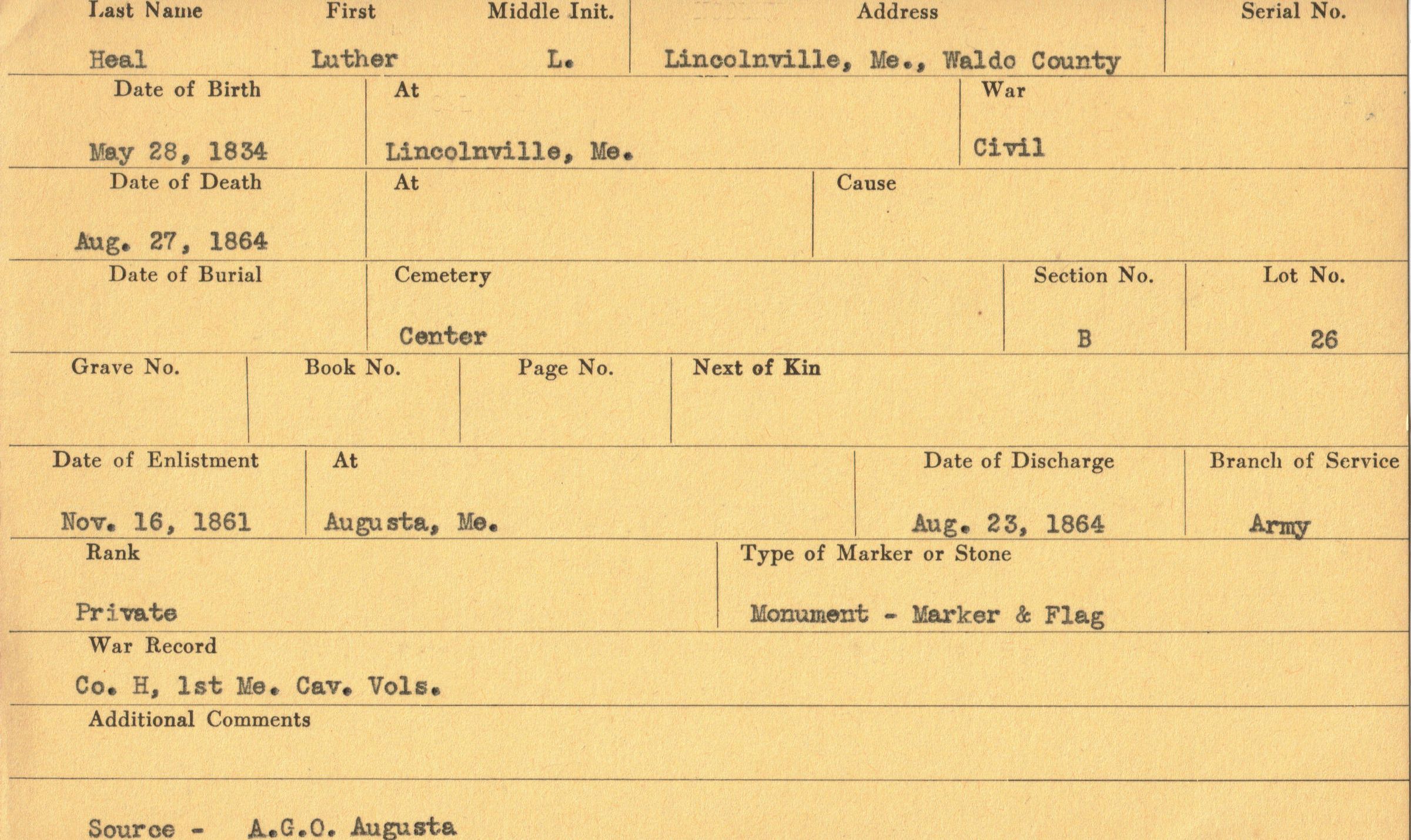 Military records of Luther L. Heal who served in the Civil War.Relationships