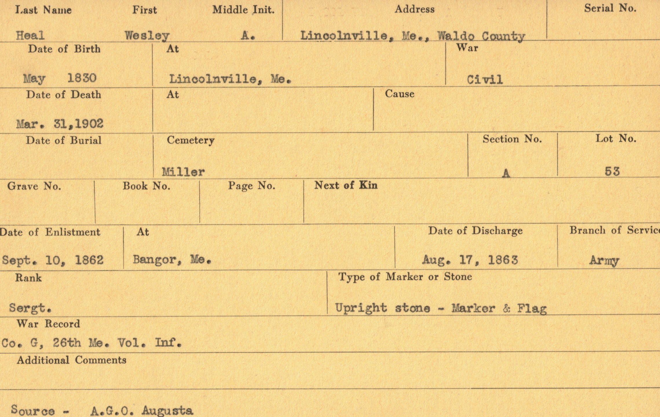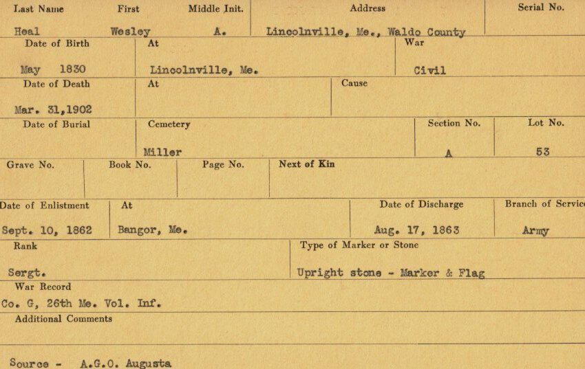 Military records of Wesley A. Heal who served in the Civil War.Relationships