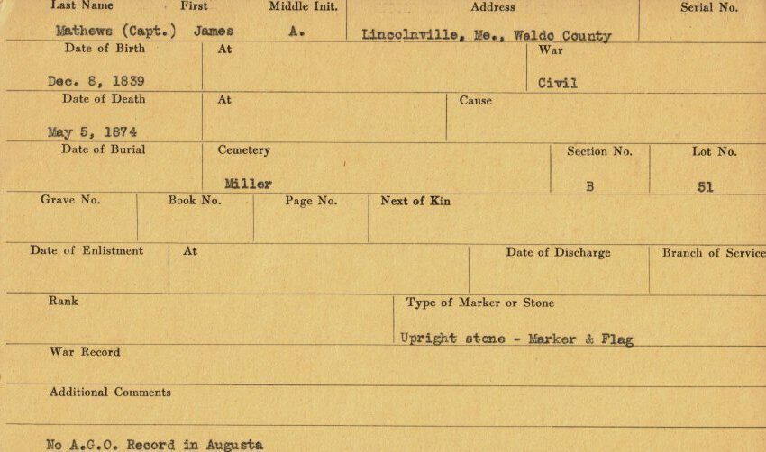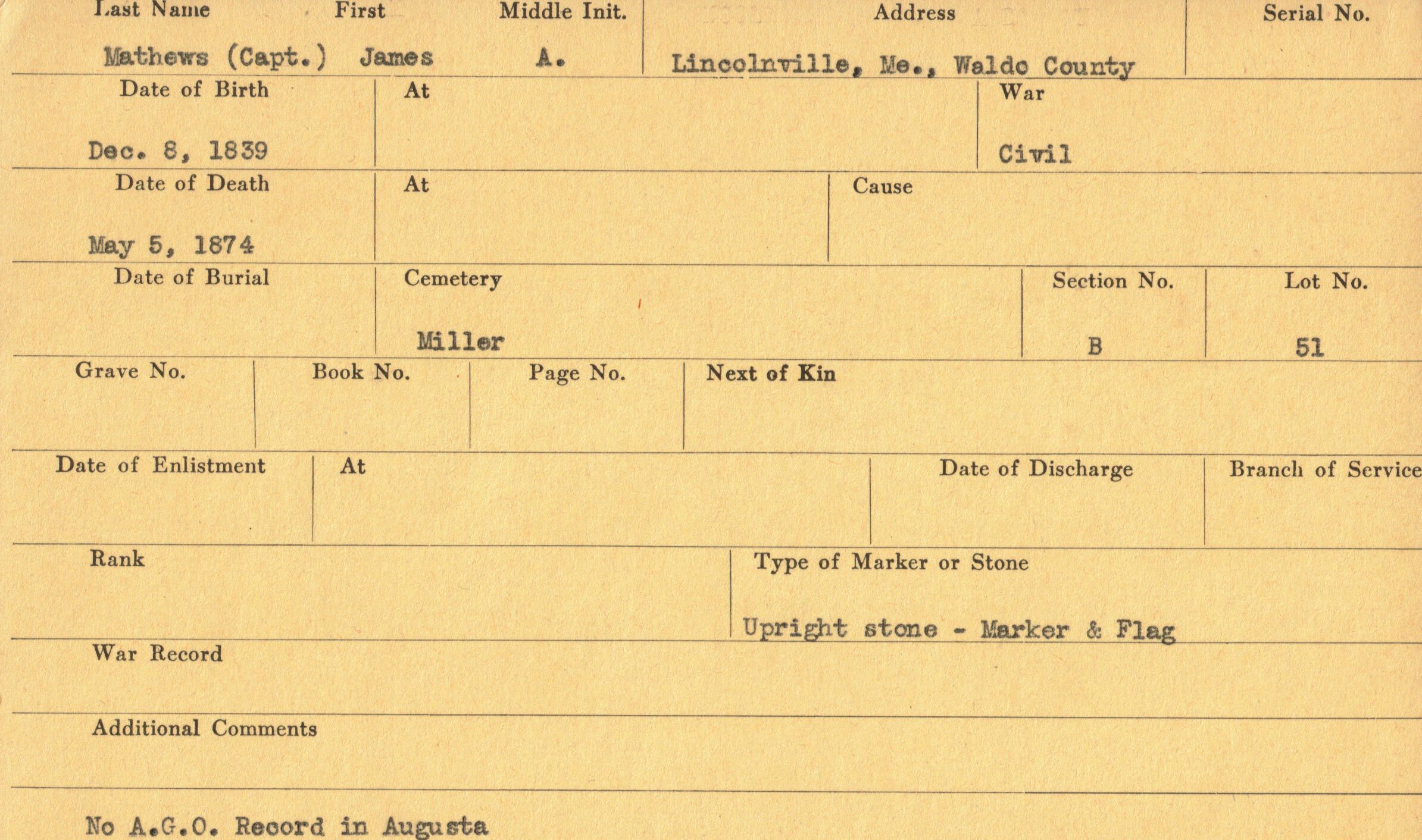 Military records of Captain James A. Mathews who served in the Civil War.Relationships