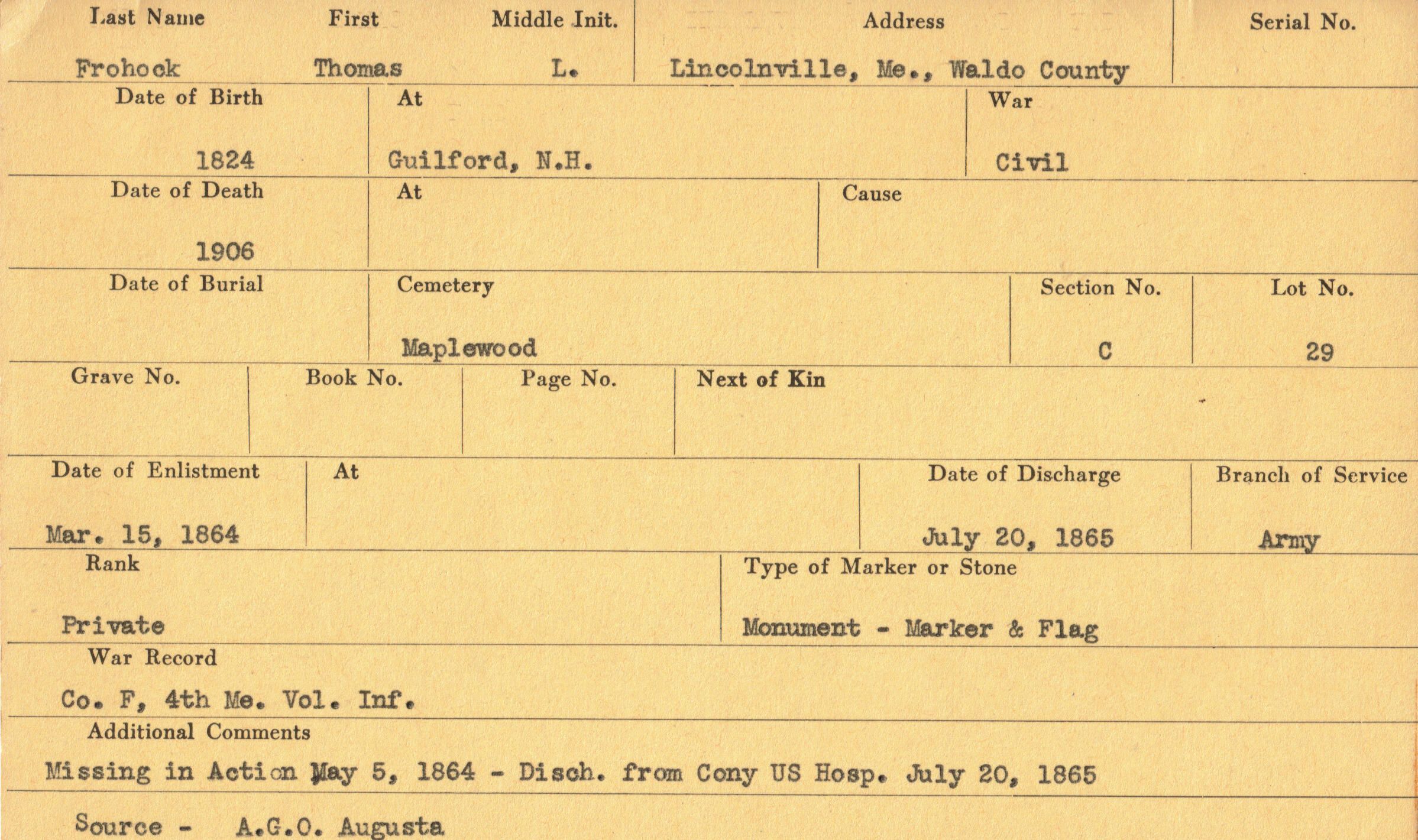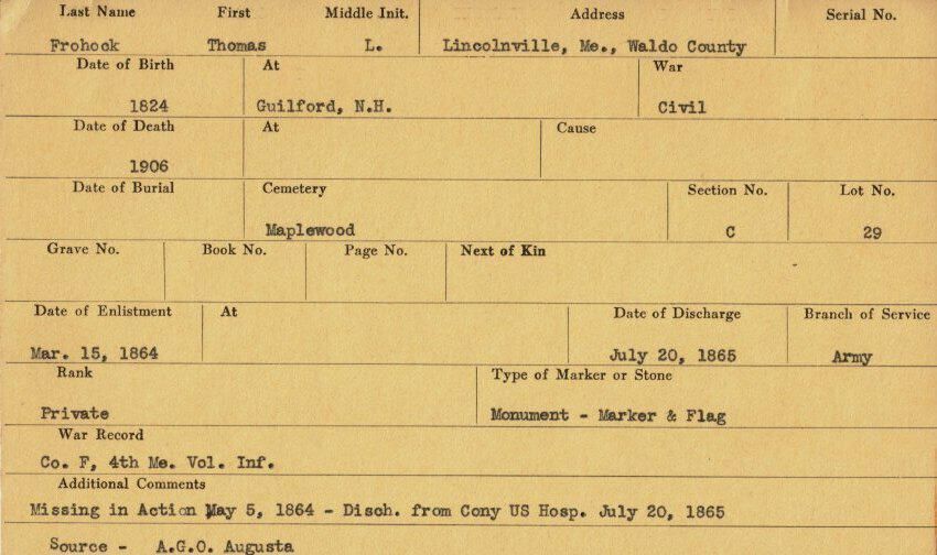Military records of Thomas K. Frohock who served in the Civil War.Relationships