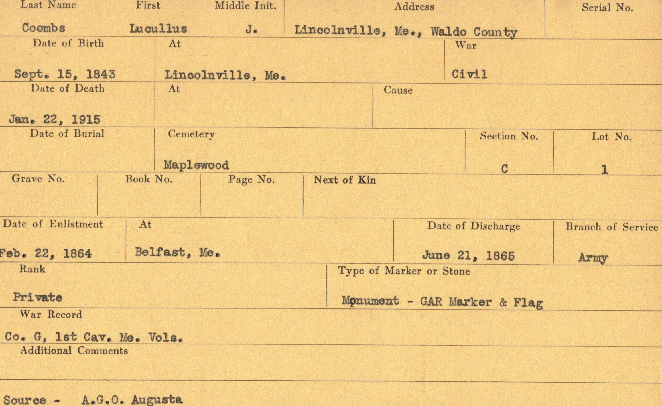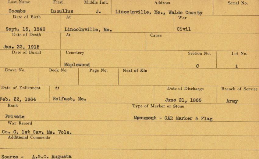 Military records of Lucullus J. Coombs who served in the Civil War.Relationships