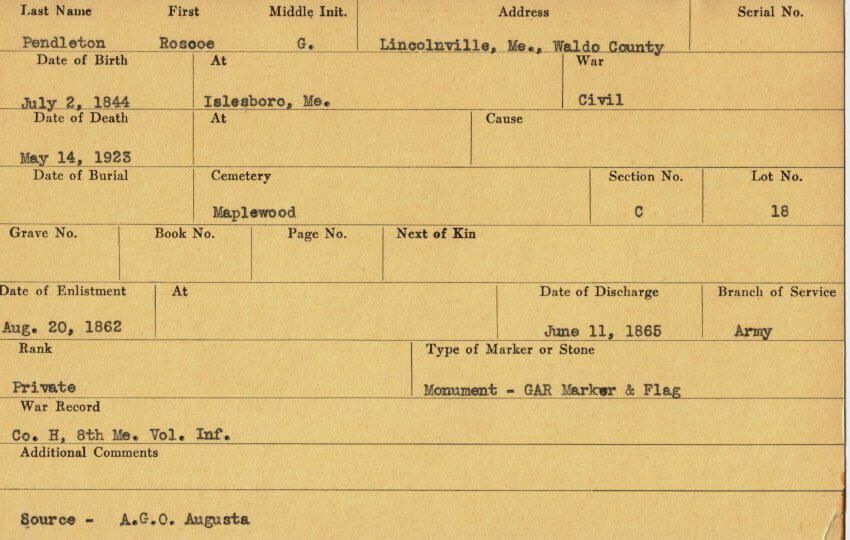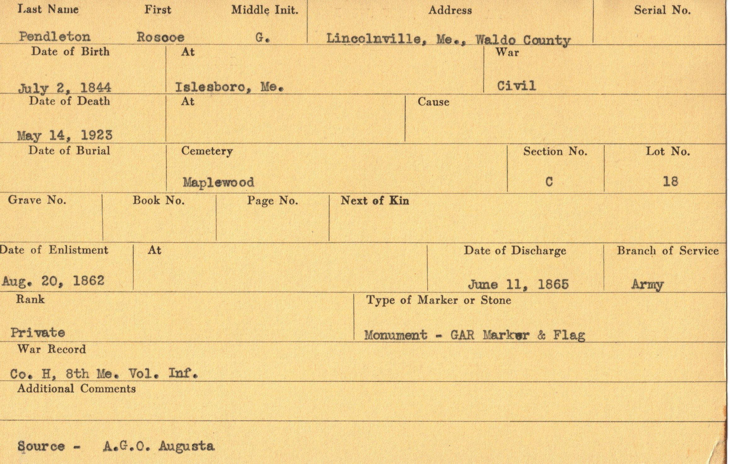 Military records of Roscoe G. Pendleton who served in the Civil War.Relationships