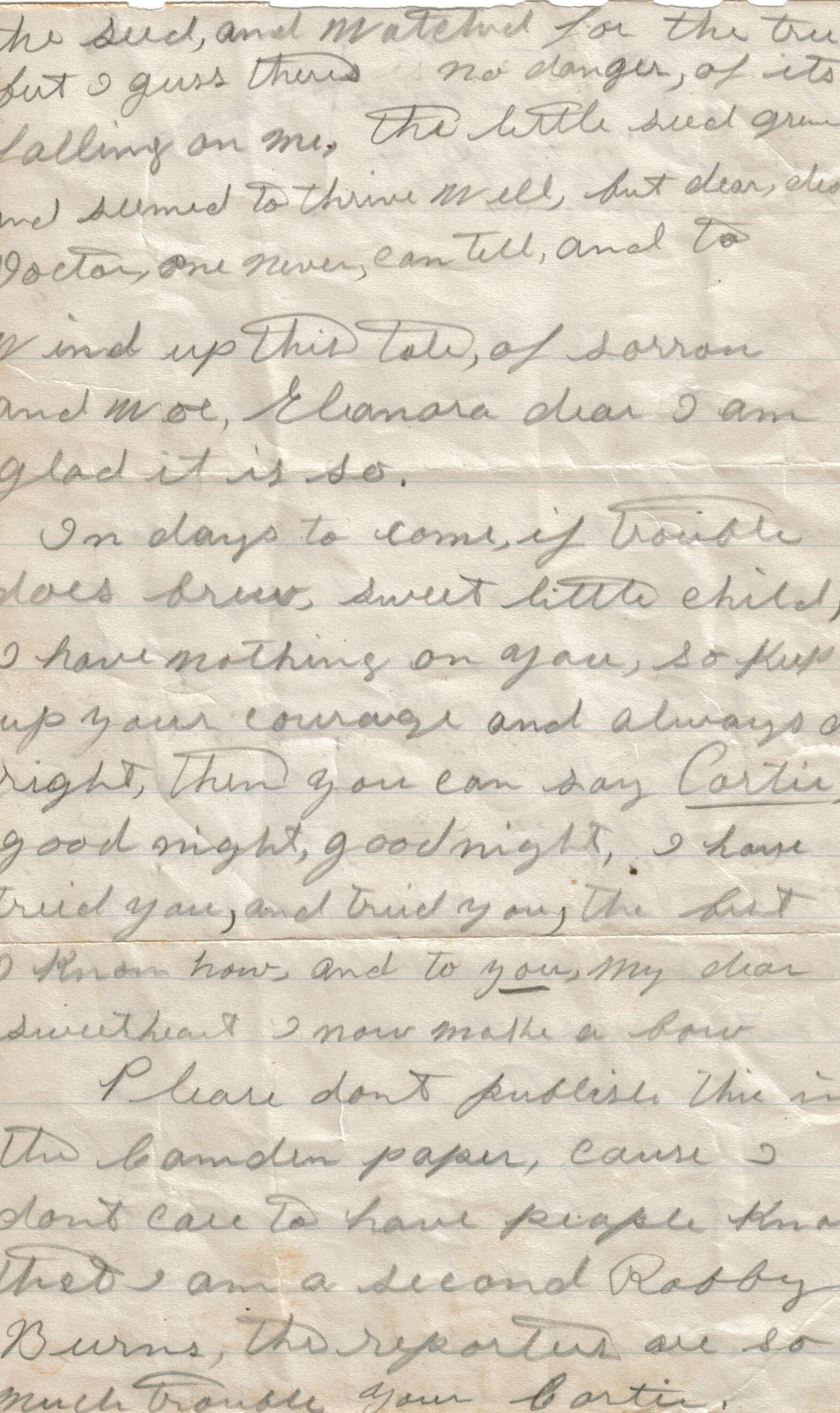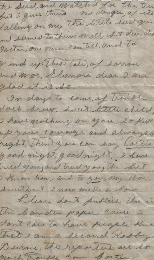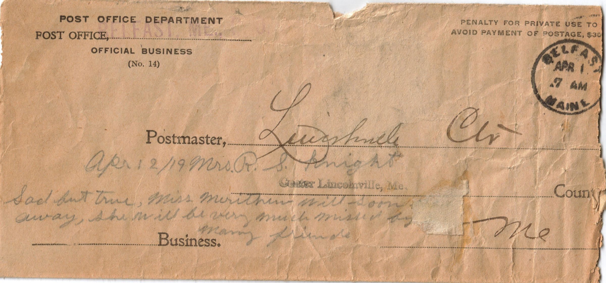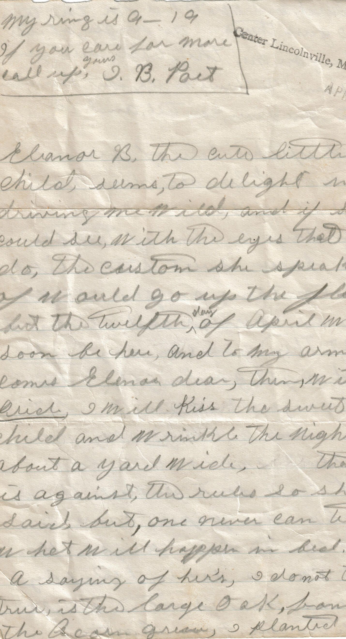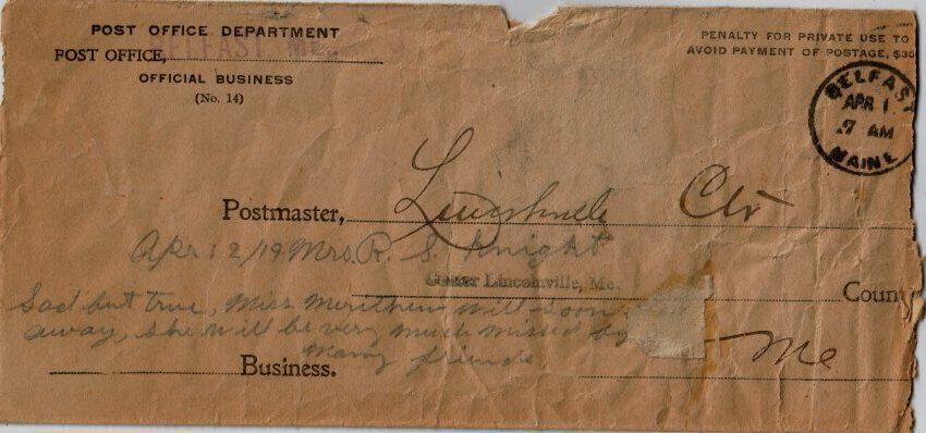 Correspondence written to Eleanora Knight from Cortis? when she was a child before her marriage. Envelope showed a return address of Belfast, Maine Post Office. A business card with the name of Harry Elias coats, suits and dresses Pittsfield, Maine was also included in the envelope.Relationships