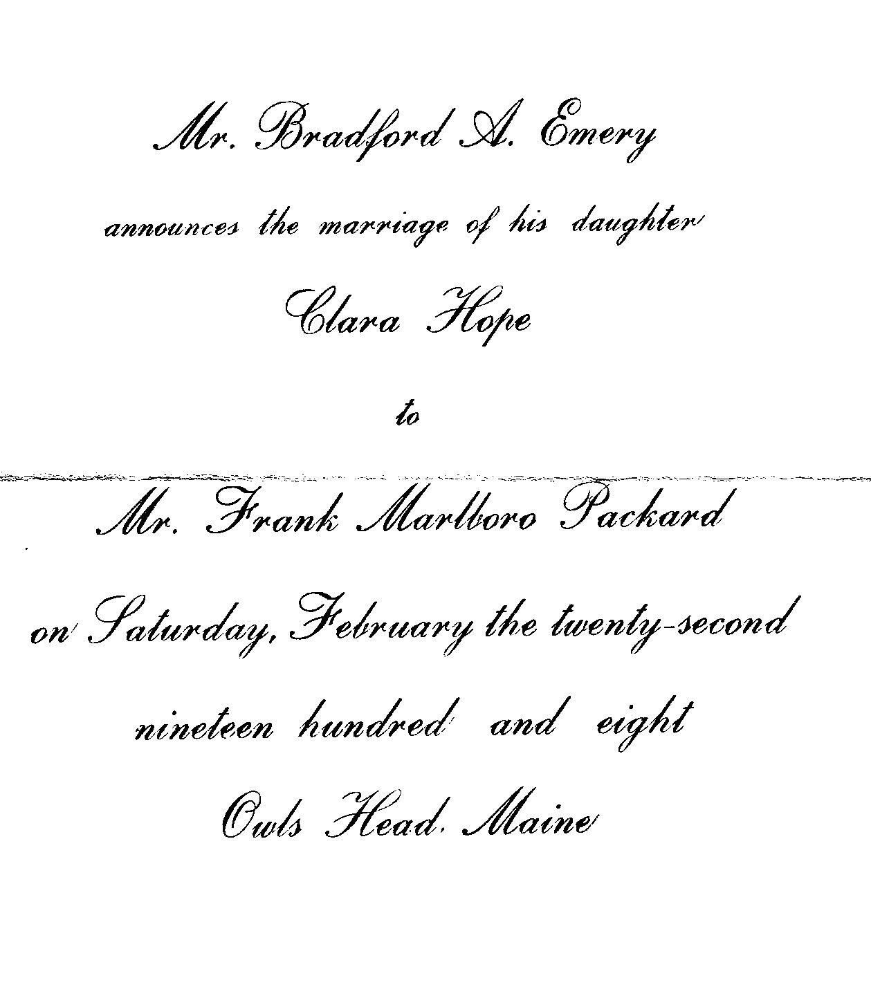 Wedding announcement for Clara Hope Emery and Frank Marlboro Packard.Relationships