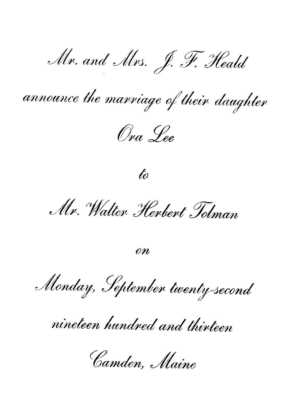 Wedding announcement for Ora Lee Heald and Walter Herbert Thomas.