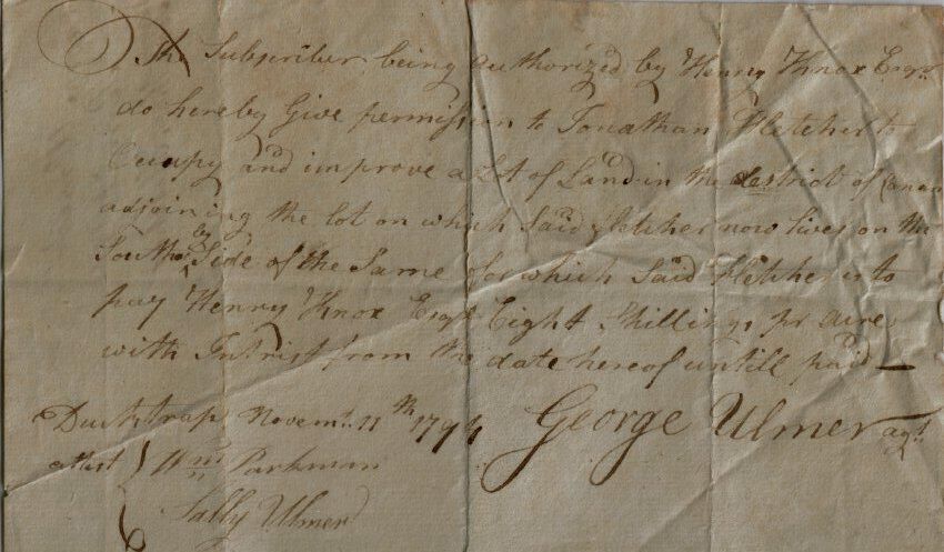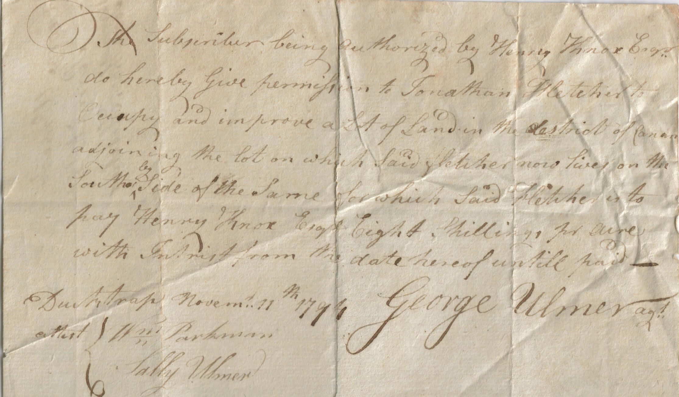Permit from George Ulmer to Jonathan Fletcher for use of land. Original from 1794 with George Ulmer's signature. Also, signatures of Sally Ulmer and William Parkman.Update Date