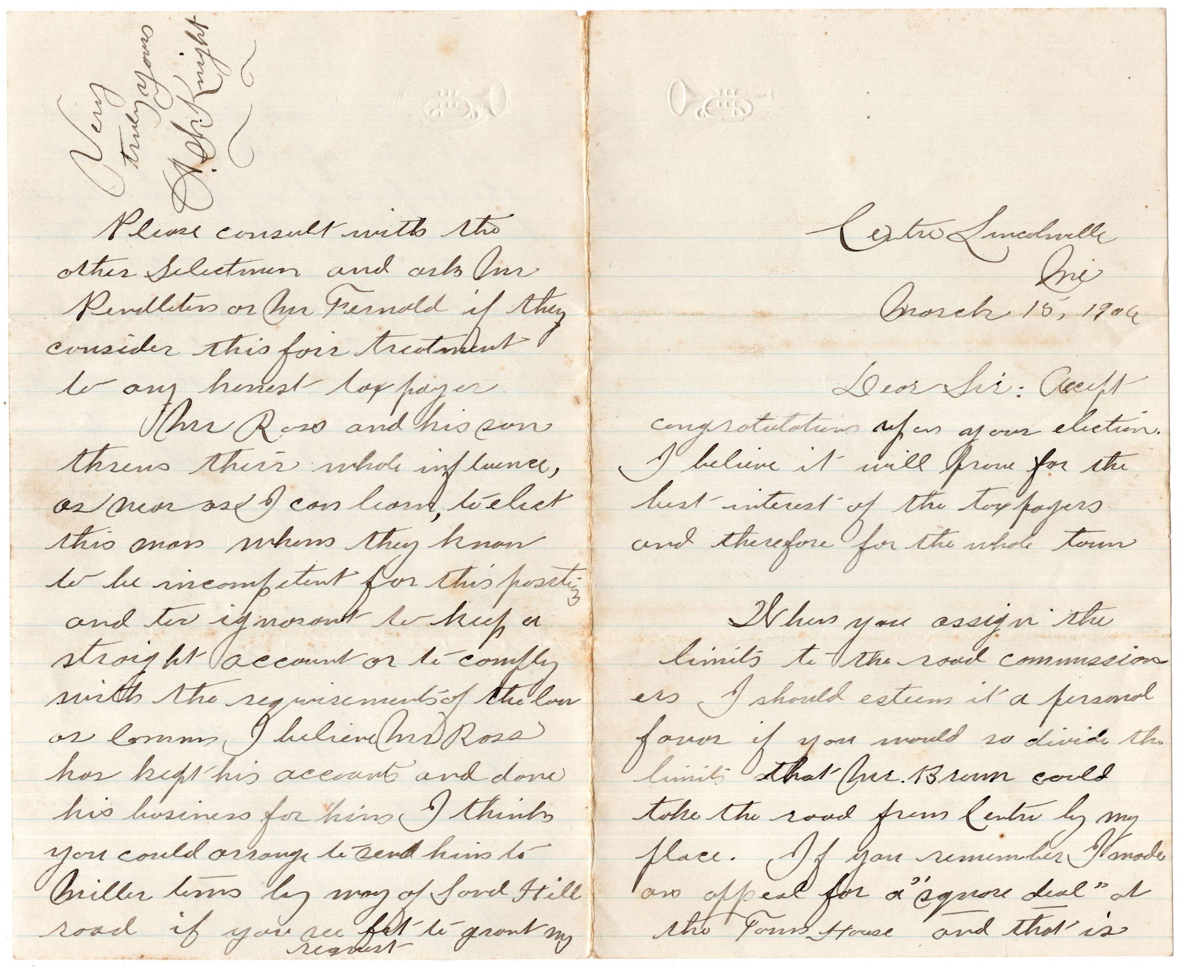 Knight Collection - 1906 Letter; March 15; Written by Arno Knight to elected Lincolnville selectman A.F. Hahn in regards to being treated fairly by the Road Commissioners Frank Rankin and John BrownRelationships