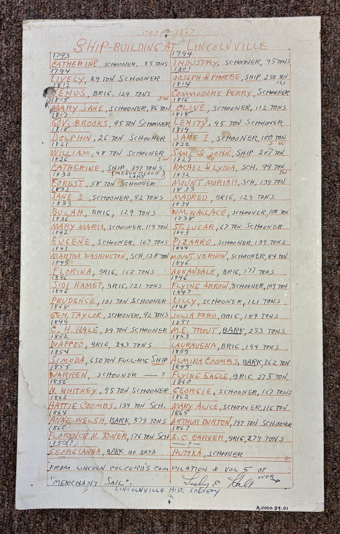 Ship Building at Lincolnville handwritten list by Lesley "Cappy" Hall; from Lincoln Colcord's Compilation & Vol. 5 of "Merchant Sail"; Years 1793-1867Relationships