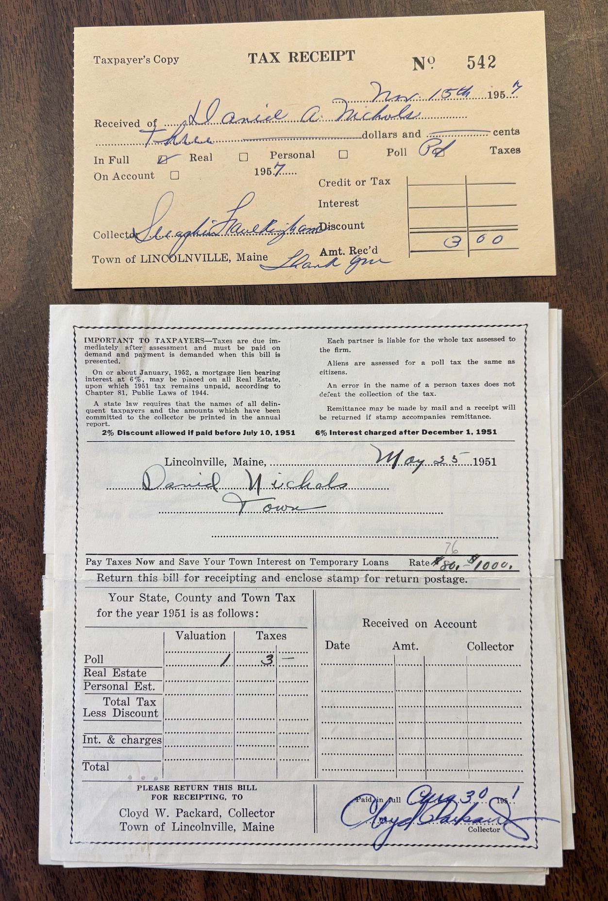 David Nichols' tax receipts from the town of Lincolnville, 1947-1957