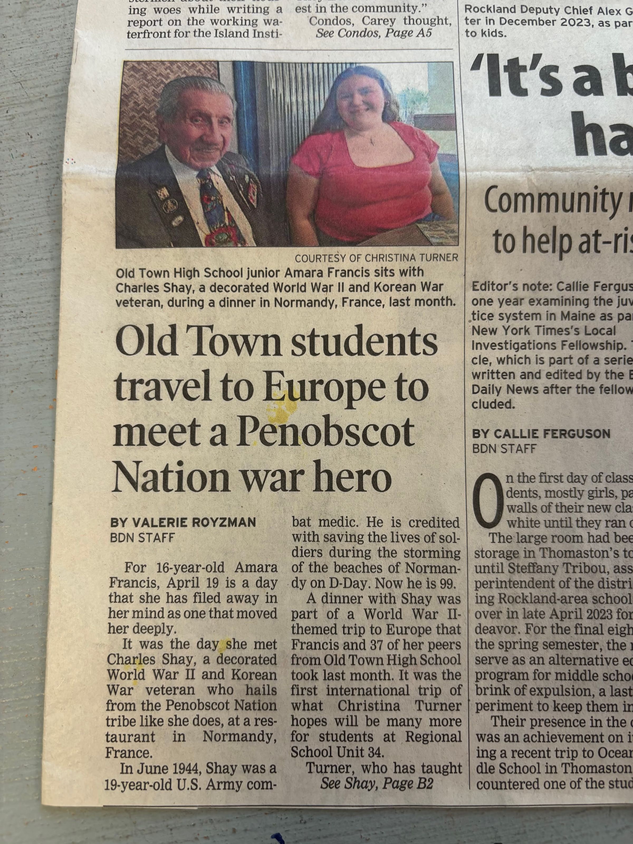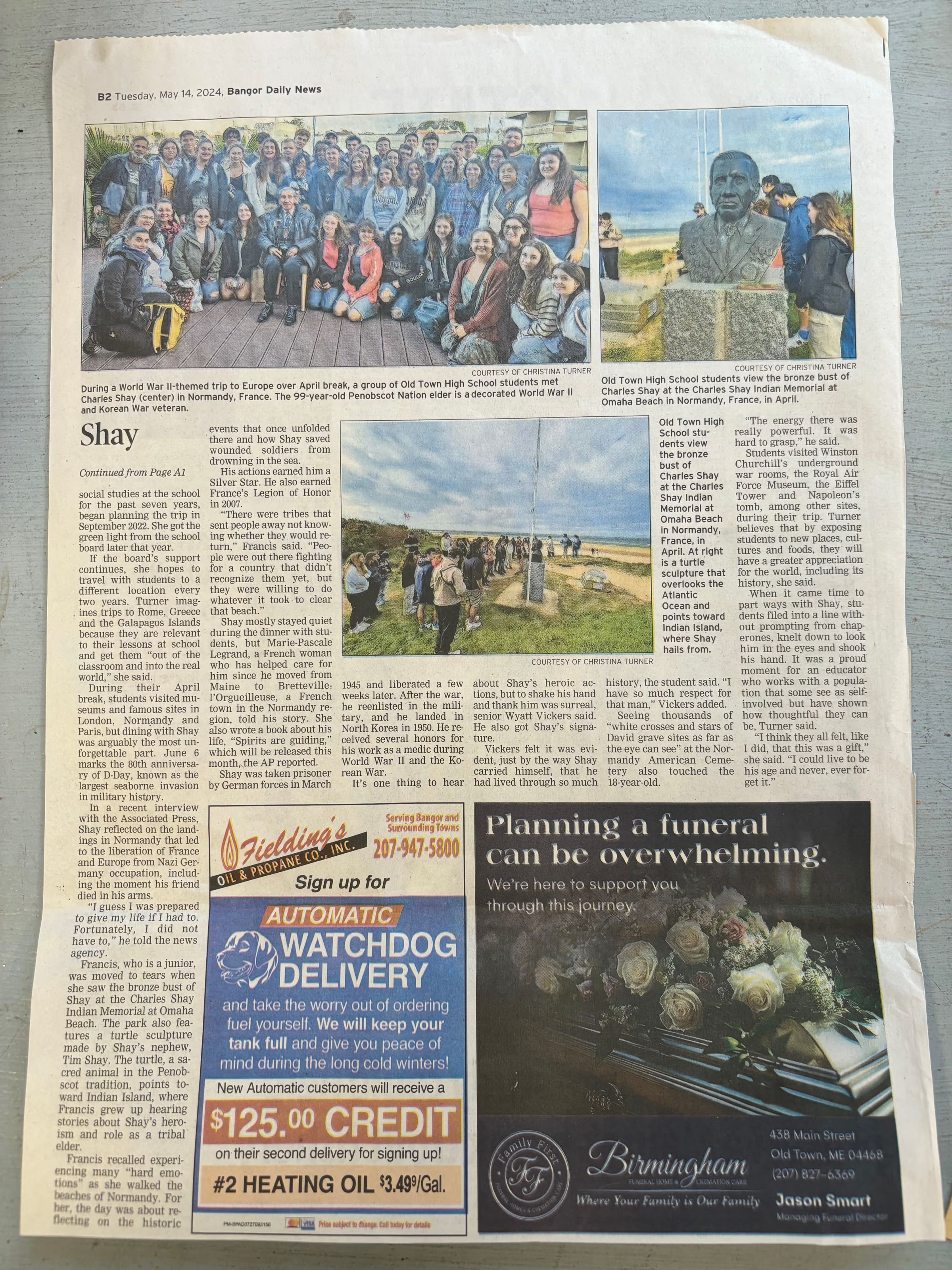 Article about a trip of Old Town High School students to France to meet Charles ShayRelationships