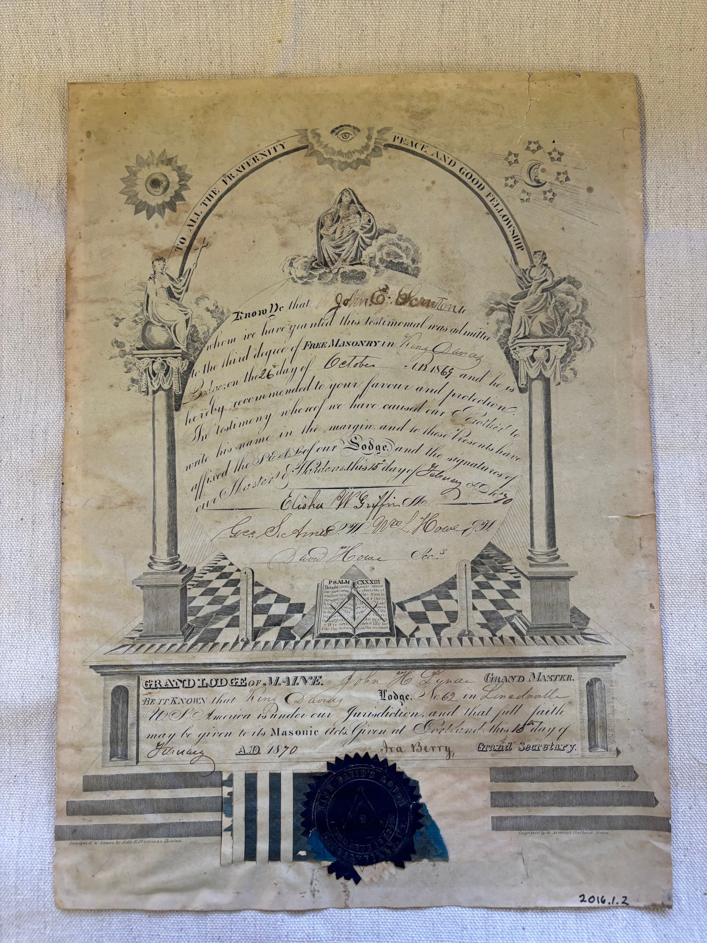 3rd Degree Mason Certificate for John E. Scruton, signed Elisha W. Griffin, George S. Ames, William Howe, David Howe