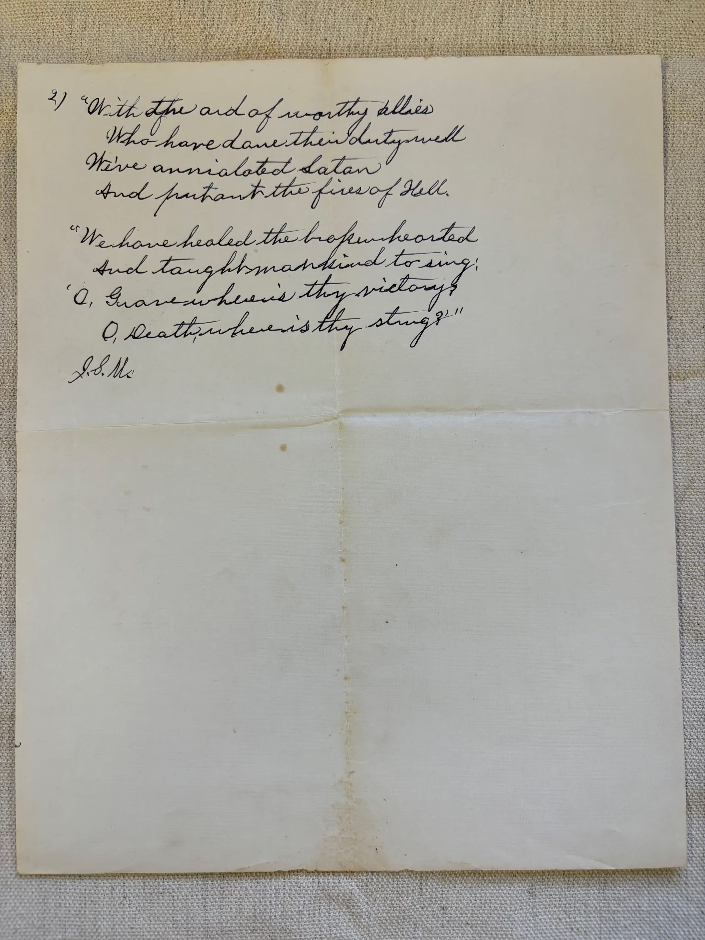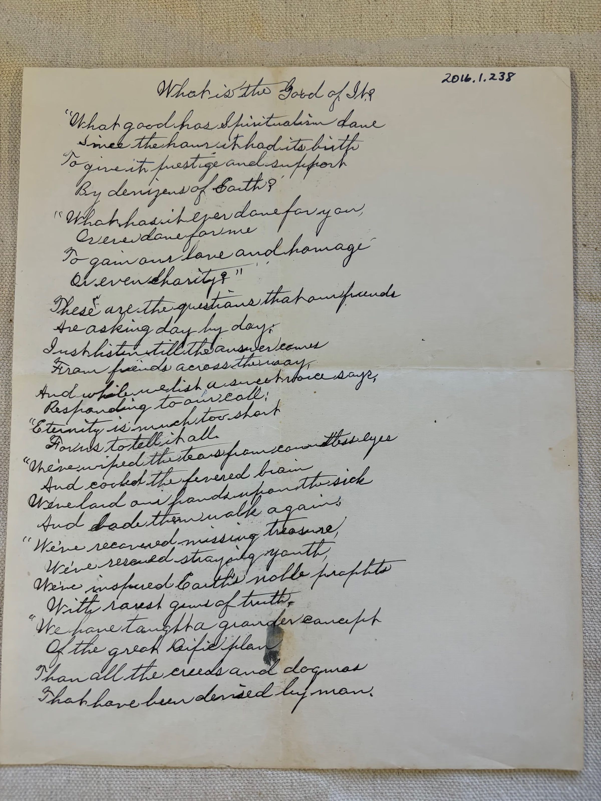 two page handwritten poem by J.S. Mullin, "What Is the Good of It?"