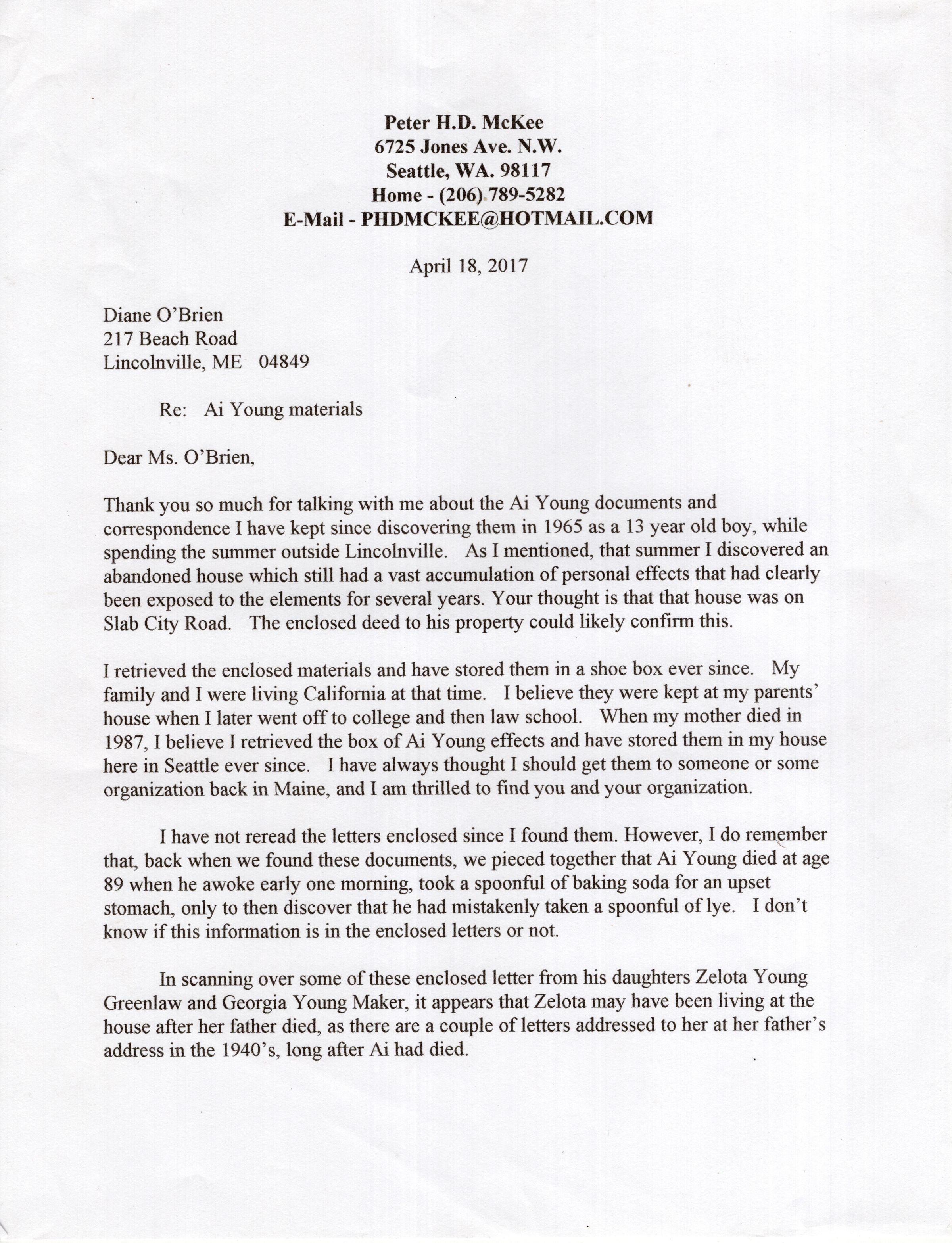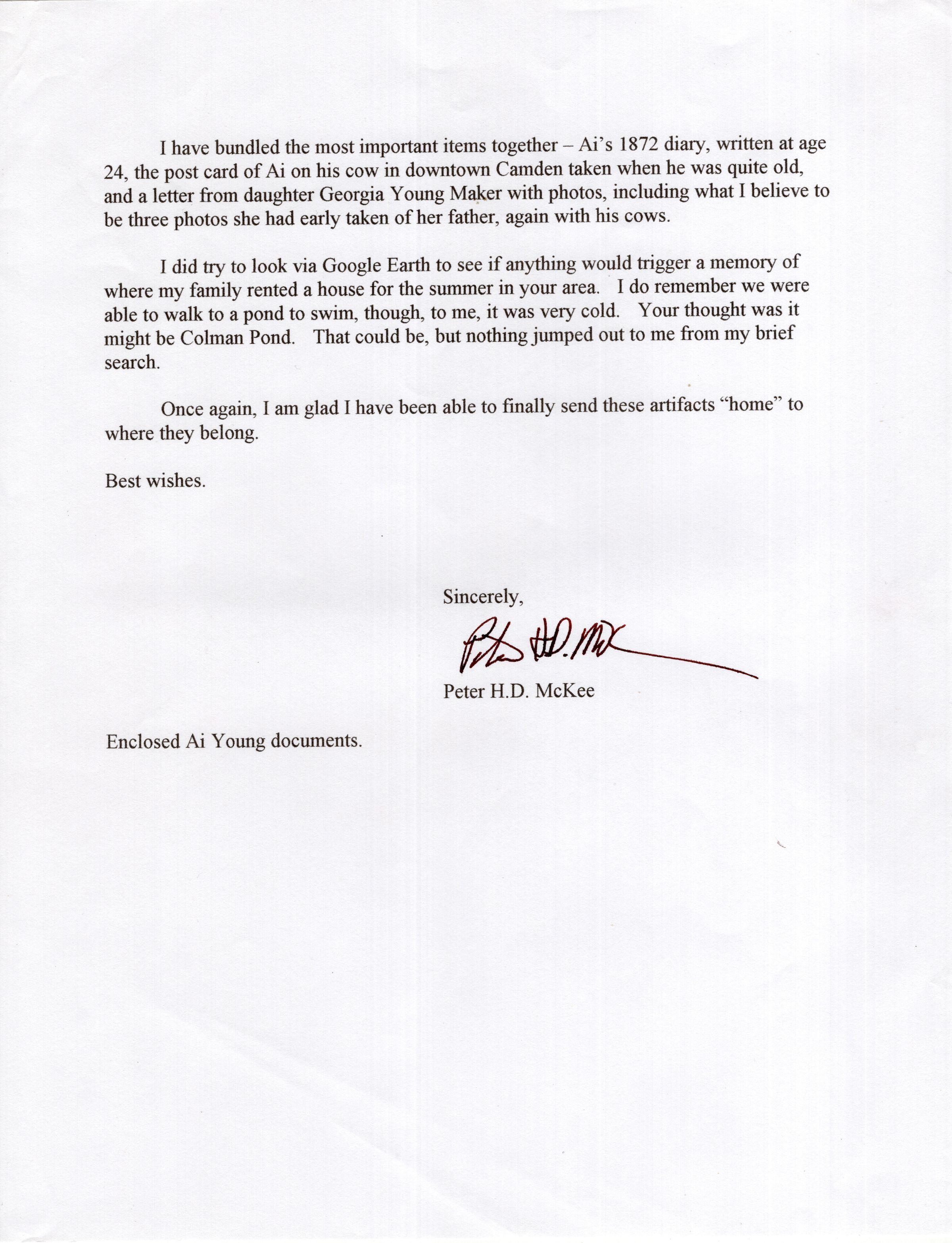 letter from Peter McKee explaining how he came to have the A.I. Young material with an attachment of A.I. Young's geneaology