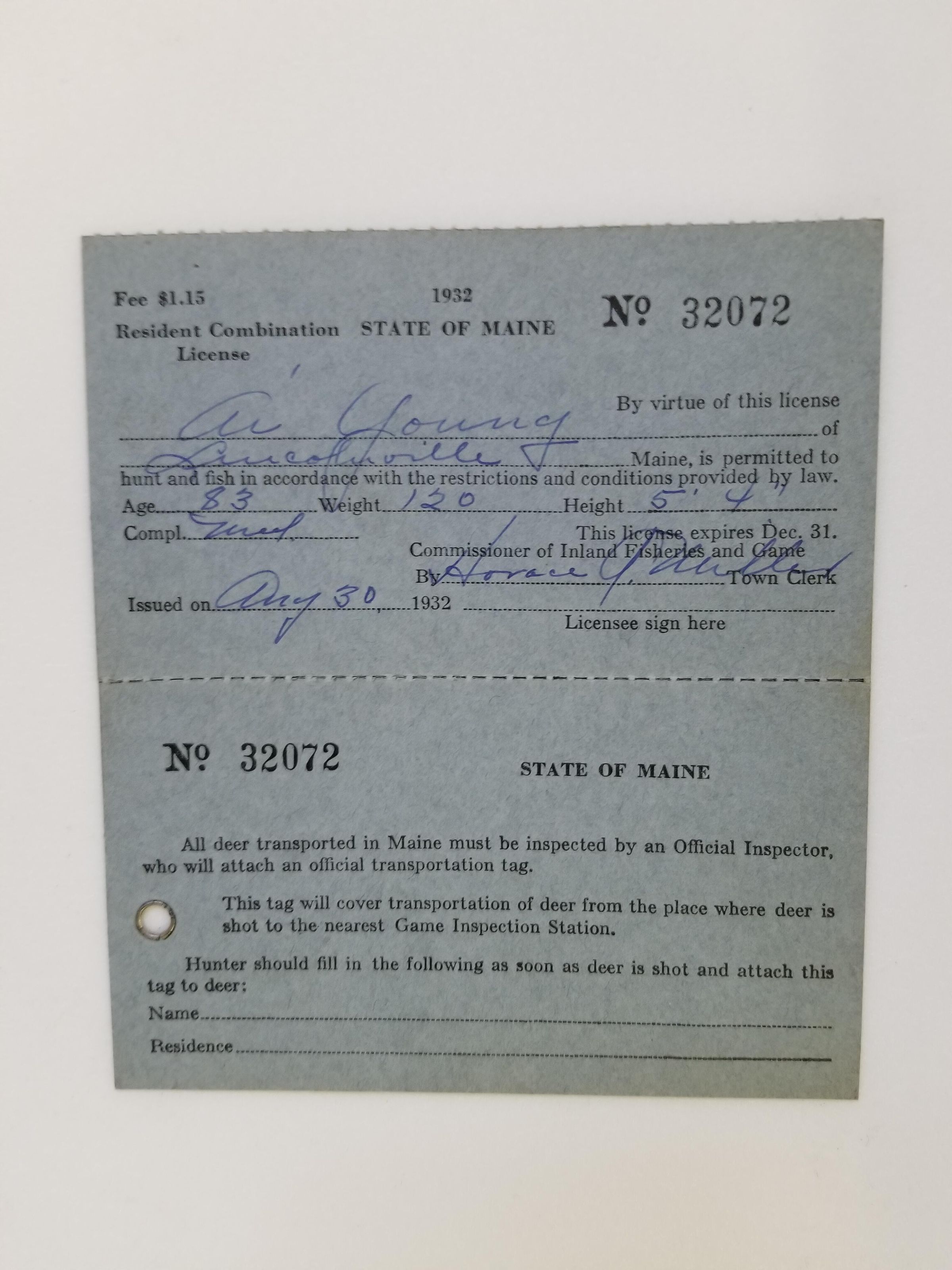 1933 book of fish and game laws, along with A.I. Young's 1932 hunting and fishing license