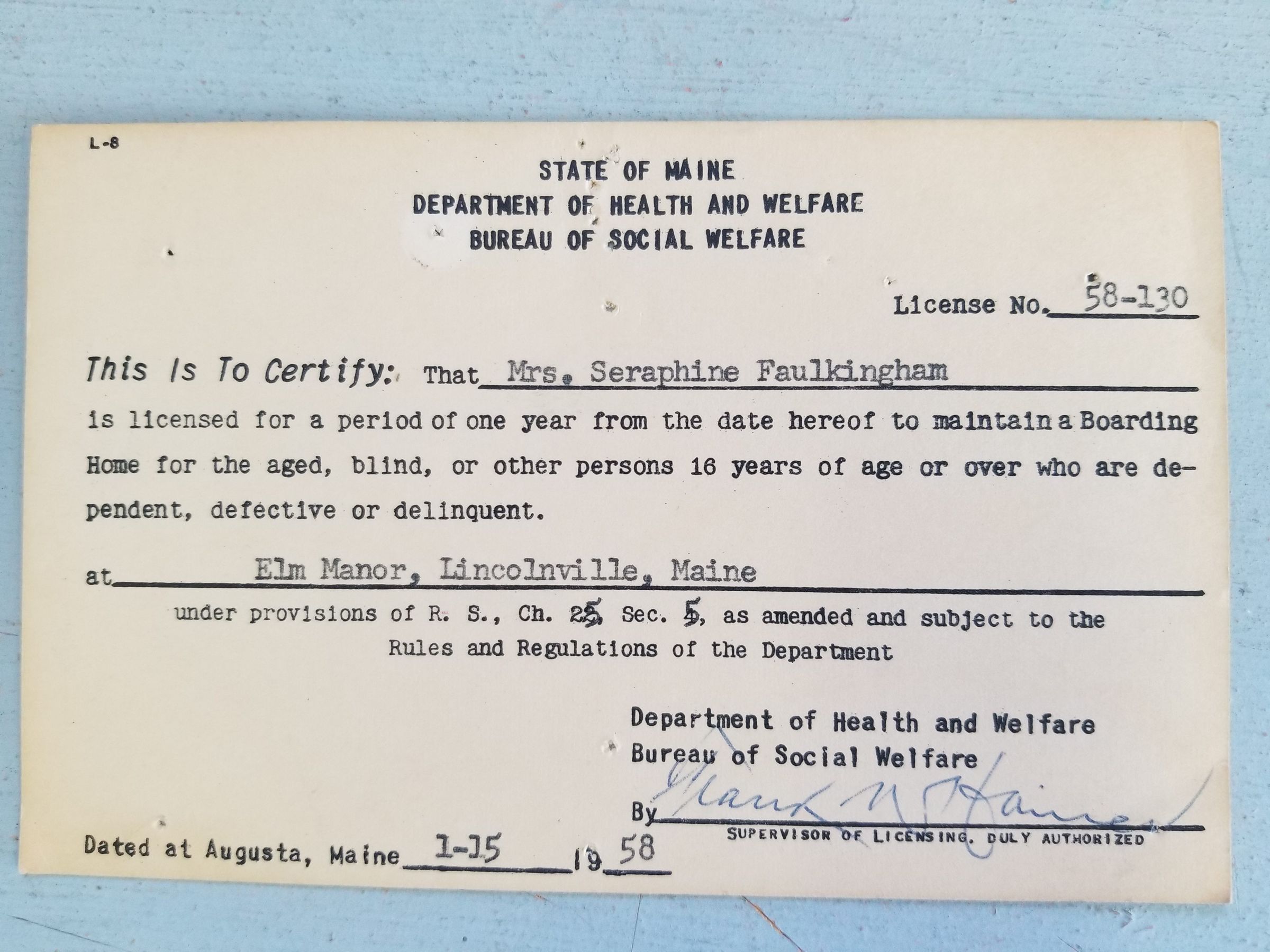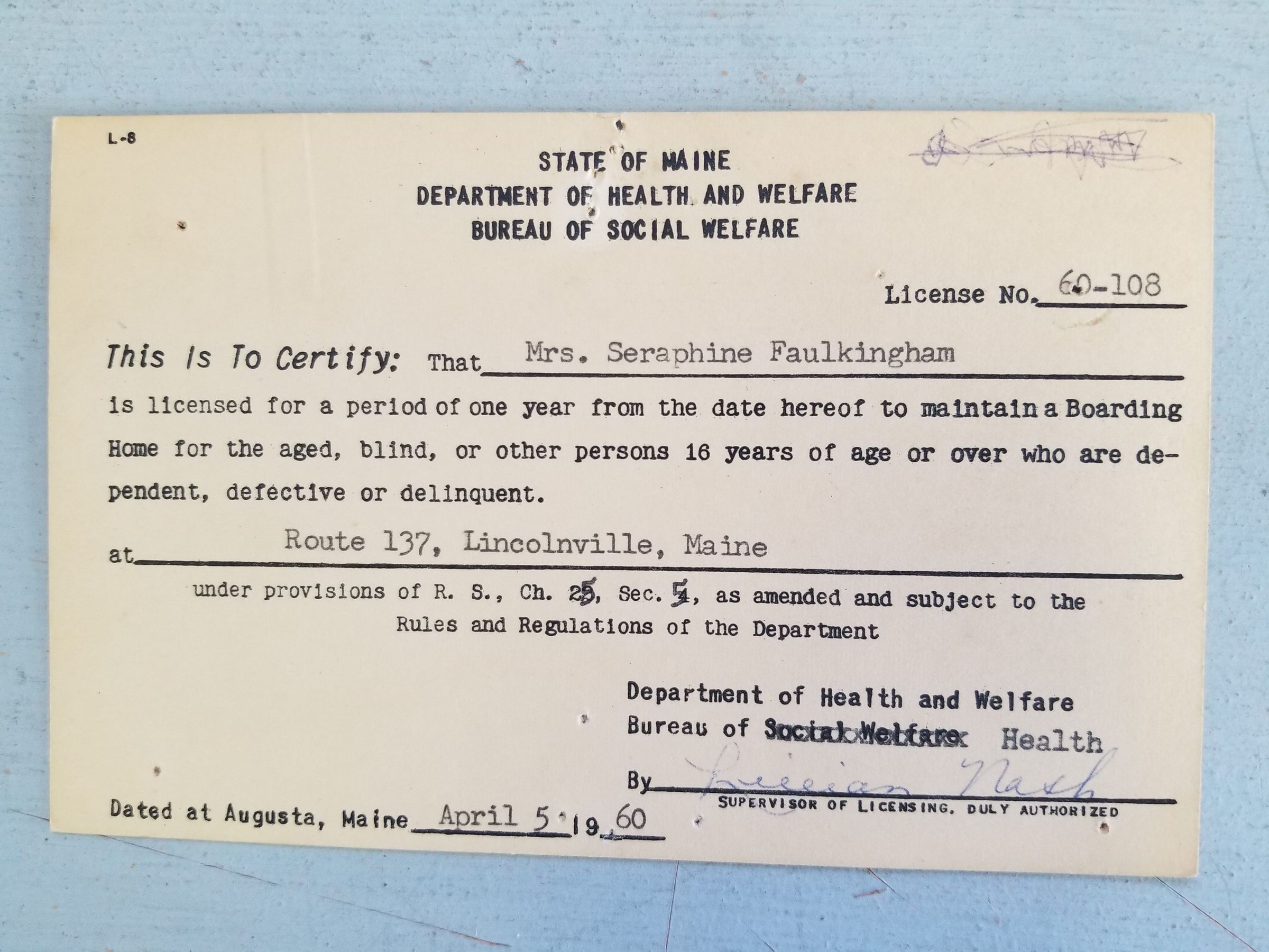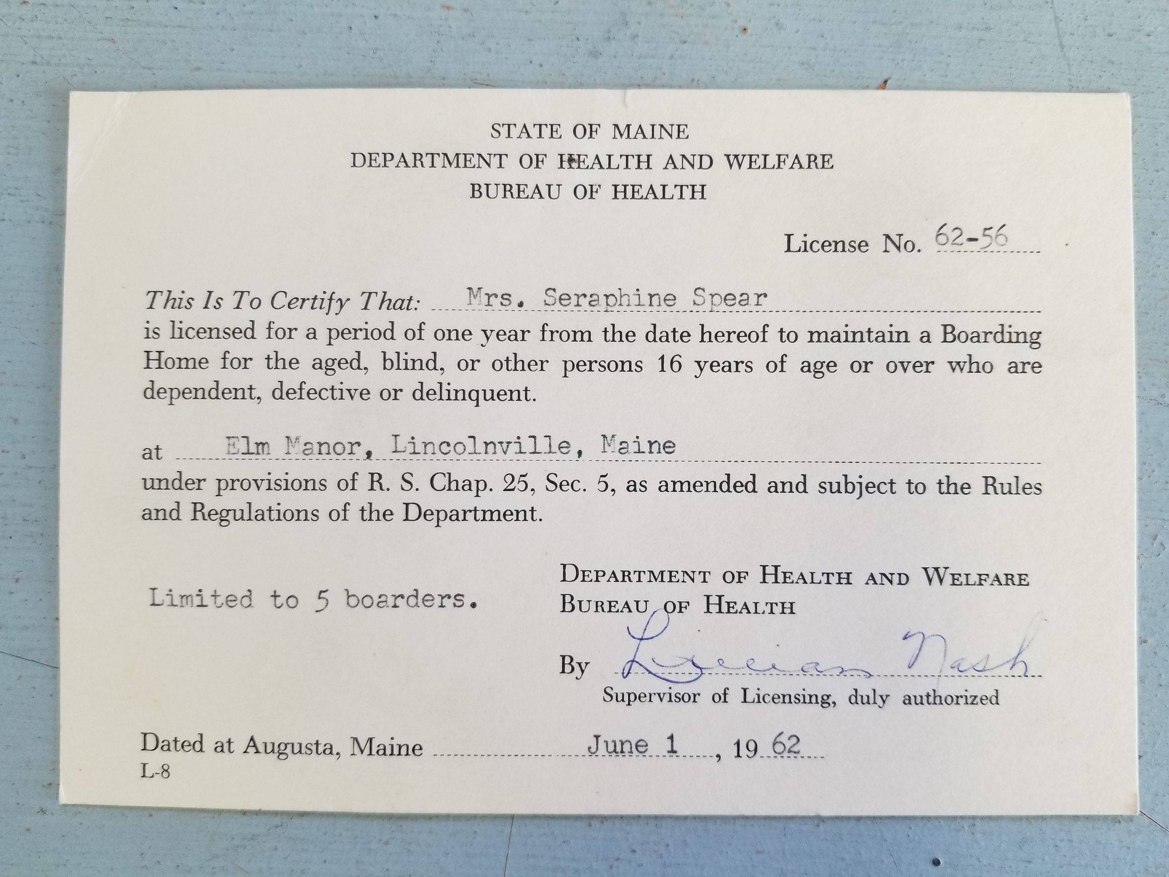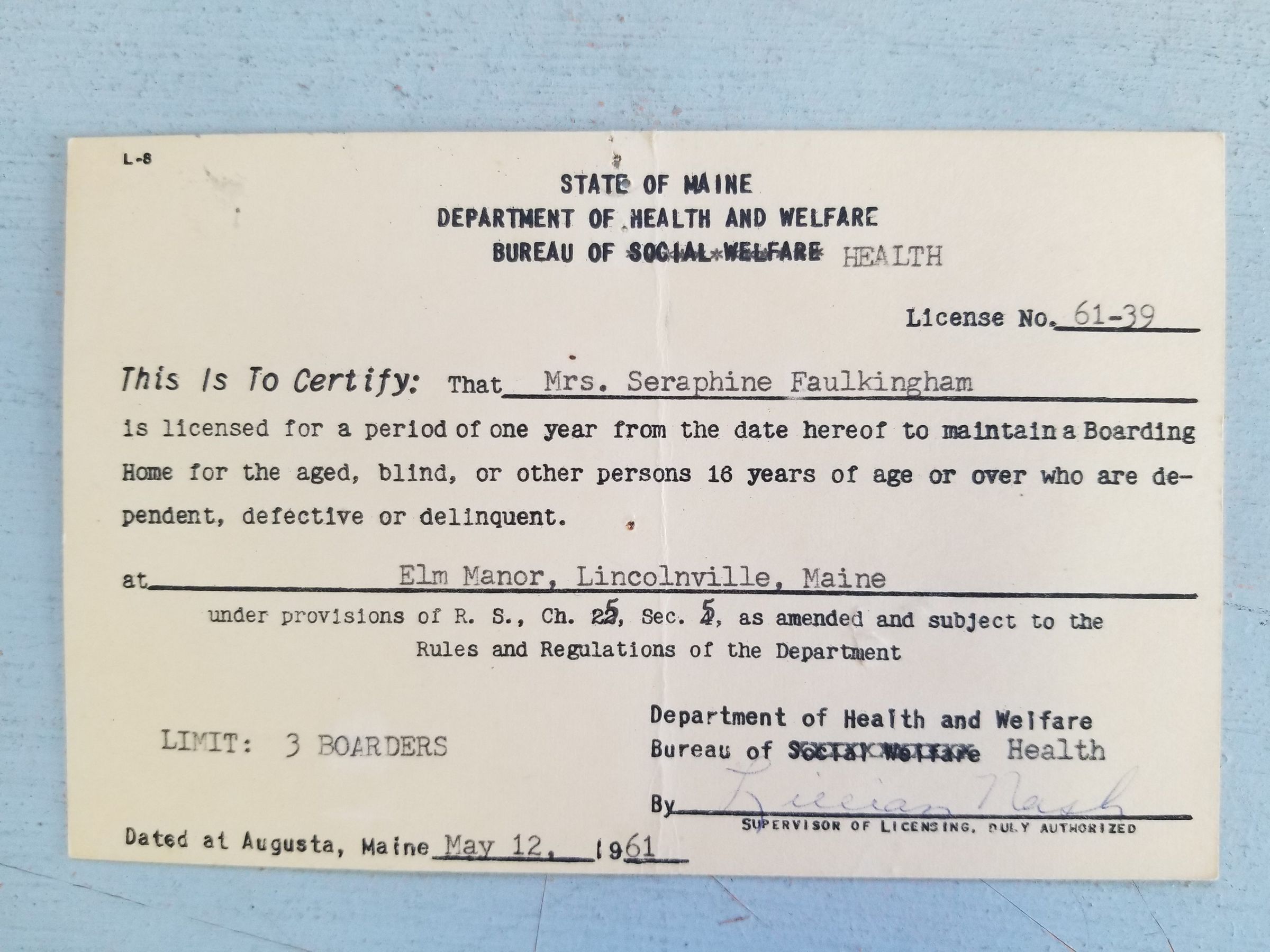 Boarding Home Licenses from the State of Maine, Bureau of Social Welfare; Issued to Mrs. Seraphine Faulkingham (Spear) in 1958, 1960, 1961 & 1962Update Date