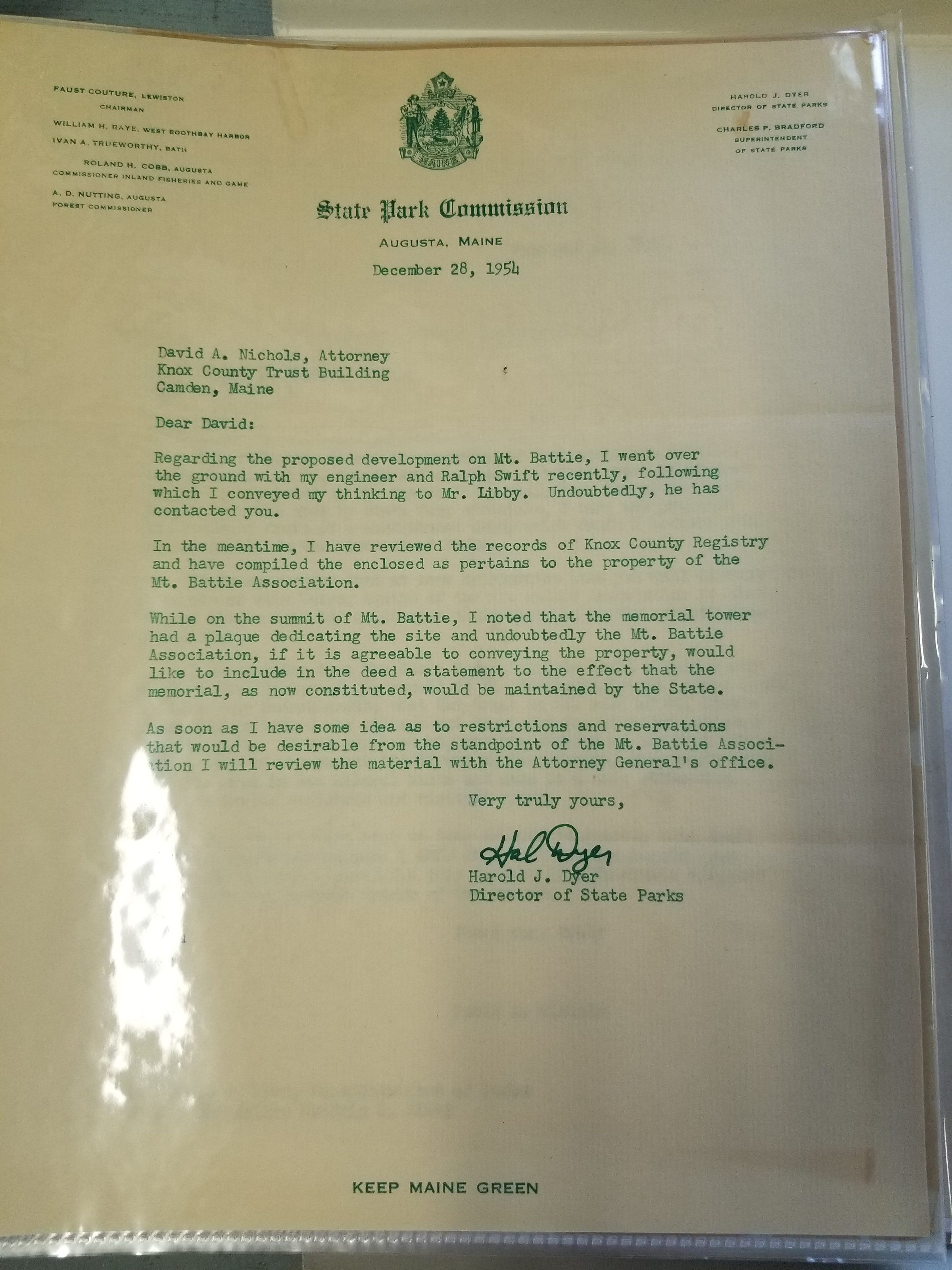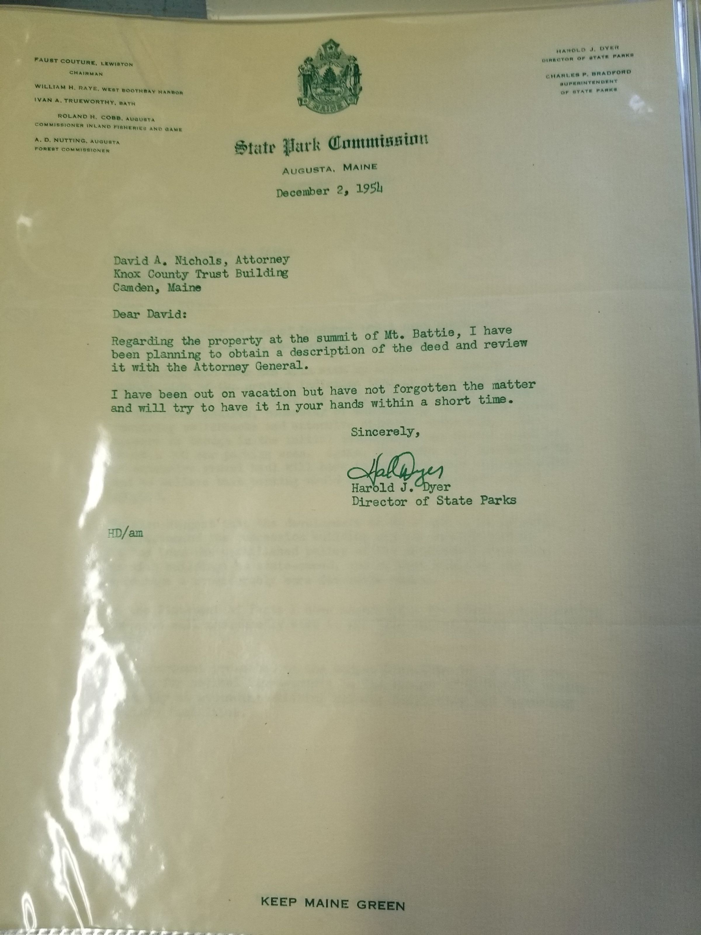 paperwork and correspondence between Maine Parks and Recreation and Camden regarding Mt. Battie. Attorney David A. Nichols records