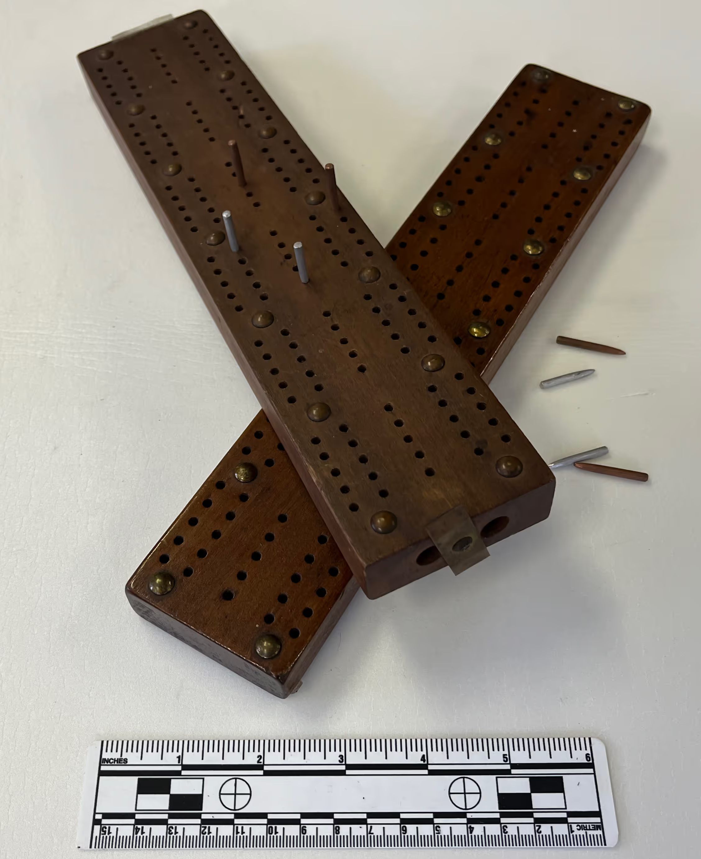 Two cribbage boards with pegs hidden inside hole