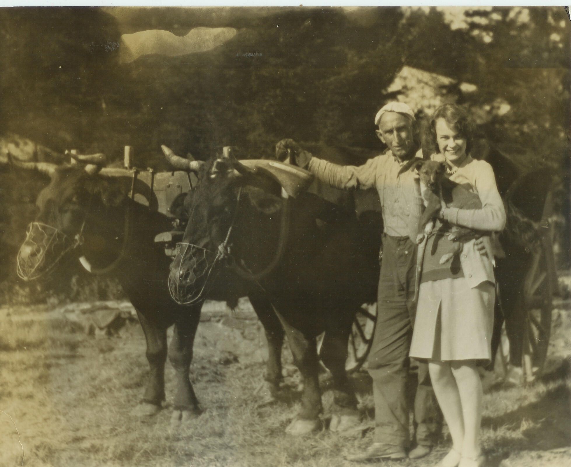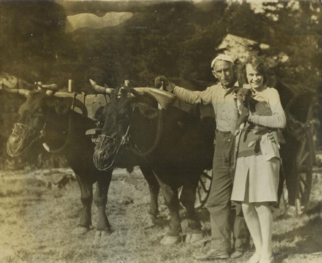Black and white original photo of Aline Davis Hulbert and unknown man with team of oxen.Relationships