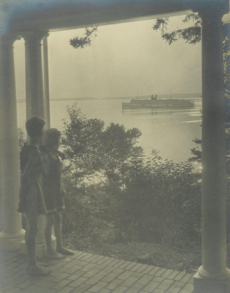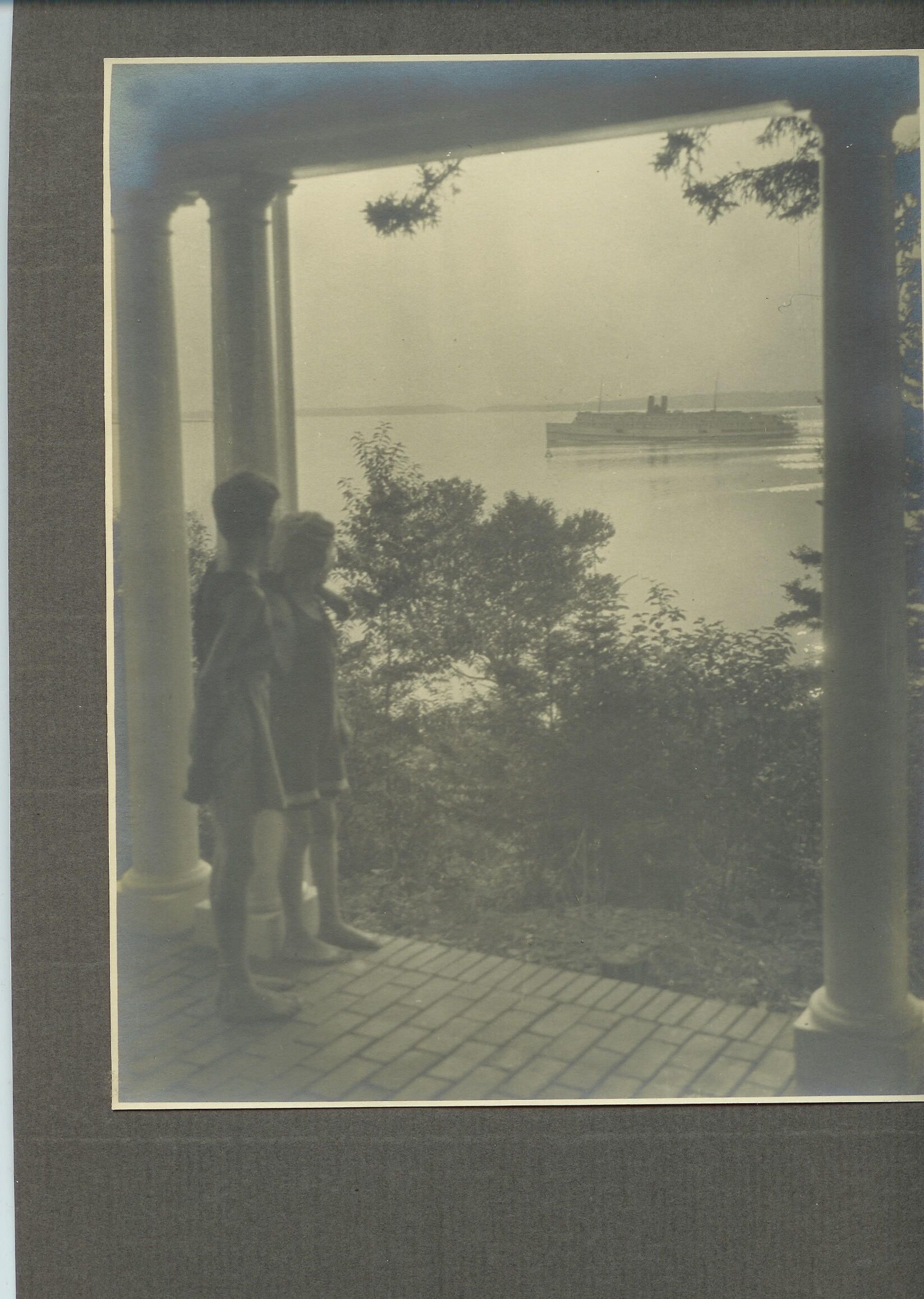 Crow's Nest, Northport, ME with Boston boat in background. Boat would blow horn when passing by to let family know that they would be in Belfast shortly and to pick up Bert Davis (children's father).Relationships