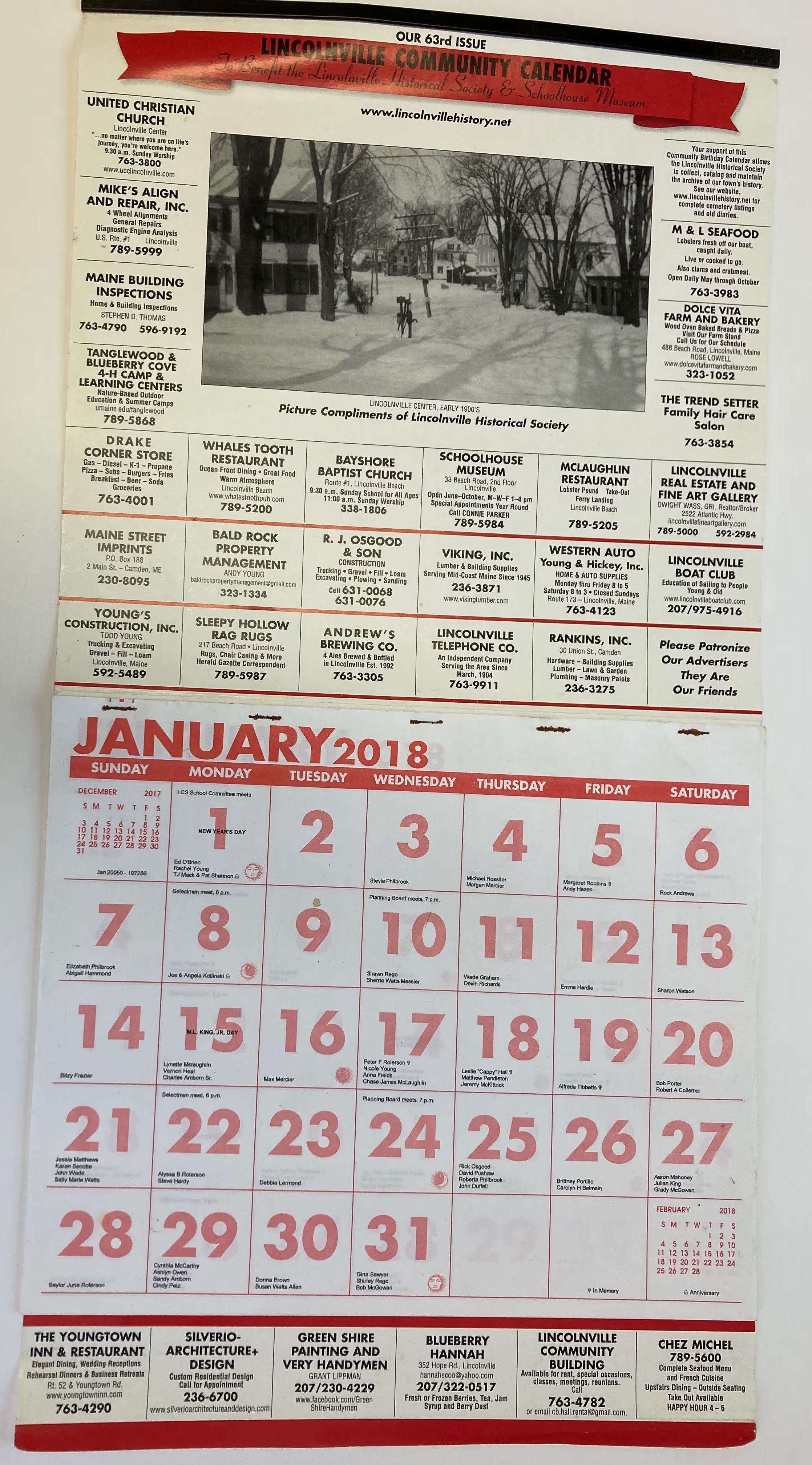 United Christian Church;, Mike's Align & Repair;, Maine Building Inspections;, Tanglewood & Blueberry Cove 4-H Camp & Learning Centers;, Drake Corner Store;, Whales Tooth Restaurant;, Bayshore Baptist Church;, Schoolhouse Museum;, McLaughlin Restaurant Take out;, Lincolnville Real Estate and Fine Art Gallery;, The Trend Setter;, Dolce Vita Farm and Bakery;, M & L Seafood;, Maine Street imprints;, Bald Rock Property Management;, R.J. Osgood & Son;, Viking, Inc.;, Western Auto Young & Hhickey, Inc.;, Lincolnville Boat Club;, Young's Construction, Inc.;, Sleepy Hollow Rag Rugs;, Andrew's Brewing Co.;, Lincolnville Telephone Co.;, Rankins' Inc.;, The Youngtown Inn & Restaurant;, Silverio-Architecture & Design;, Green Shire Painting and Very Handymen;, Blueberry Hannah;, Lincolnville Community Building;, Chez Michel