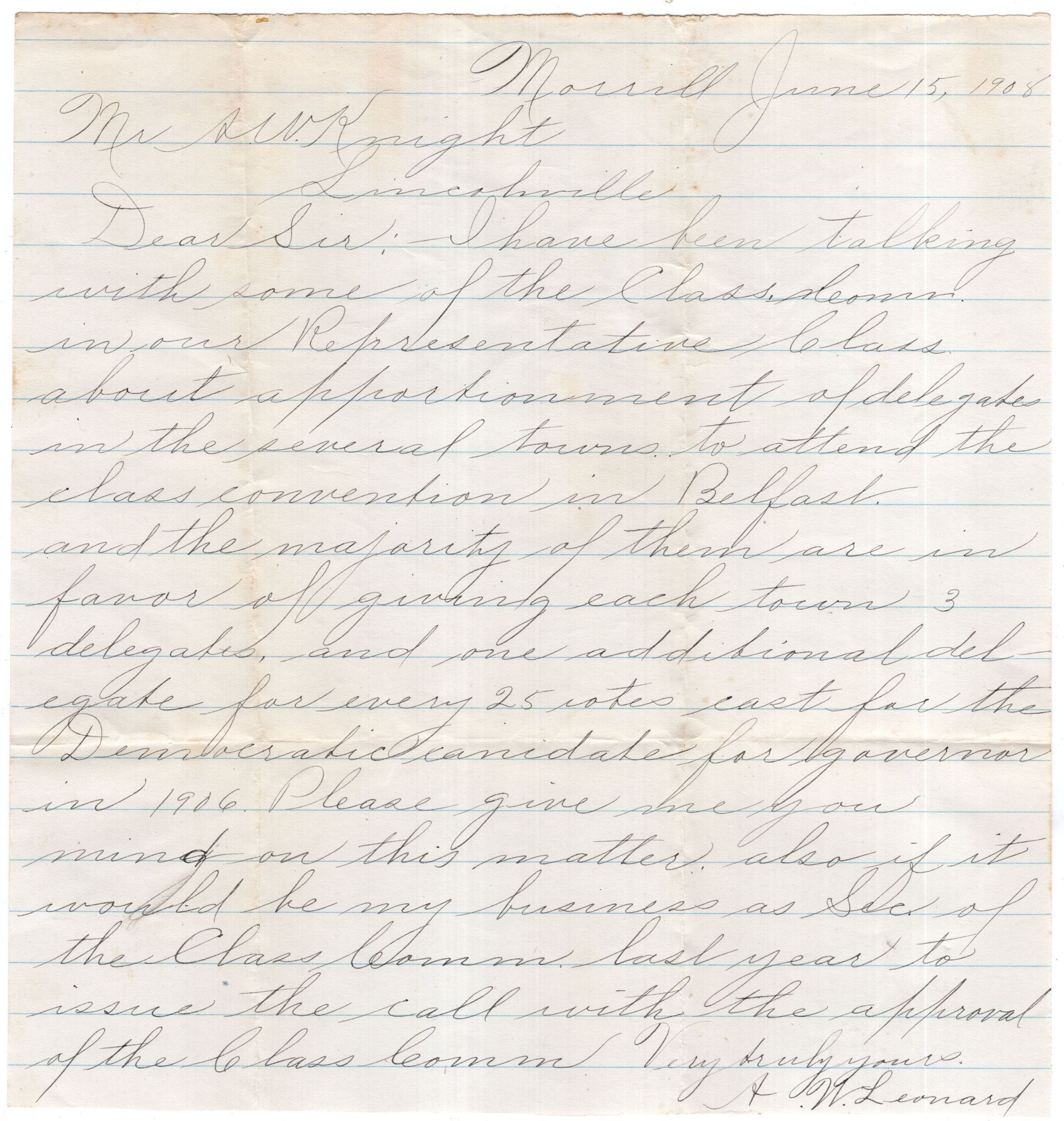 Knight Collection - 1908 Letter; Dated June 15; Written by A.W. Leonard to Arno Knight requesting his opinion on sending delegates to the Democratic convention in BelfastRelationships