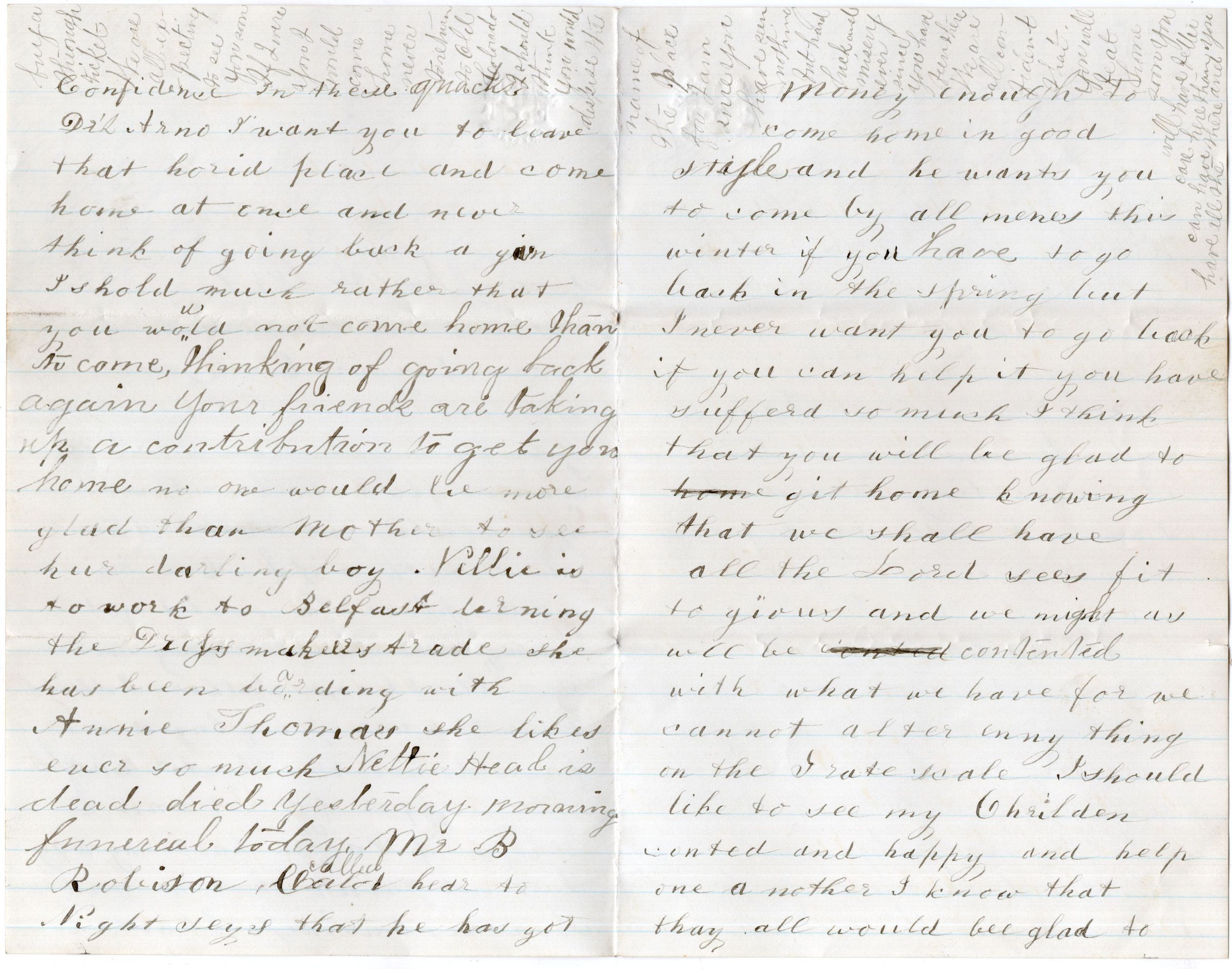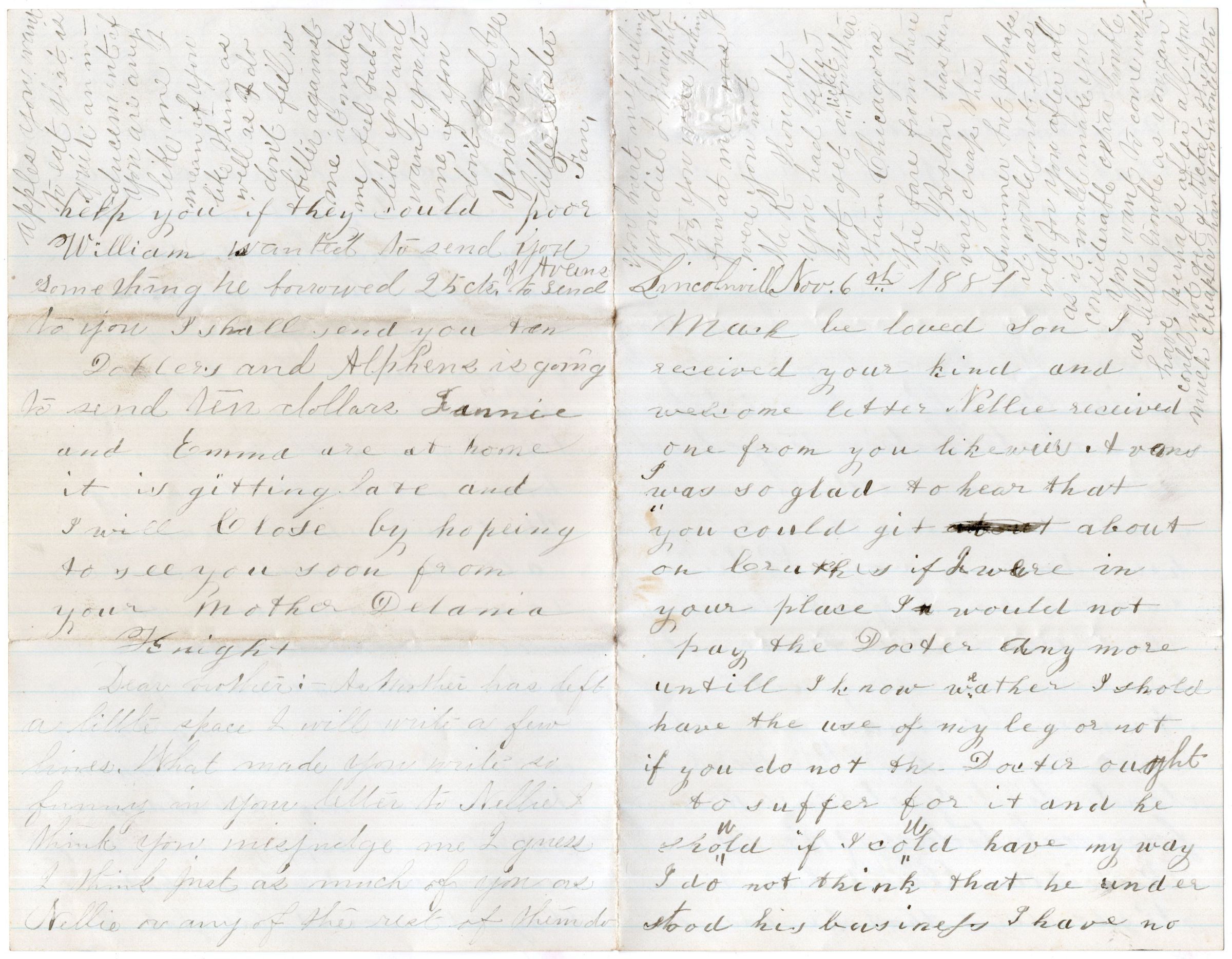 Knight Collection - 1881 Letter; Dated November 6th; Written by Delania Knight and Fannie Knight to Arno Knight; Arno is working in Colorado and is recovering from having his leg broken badly in a mine explosion