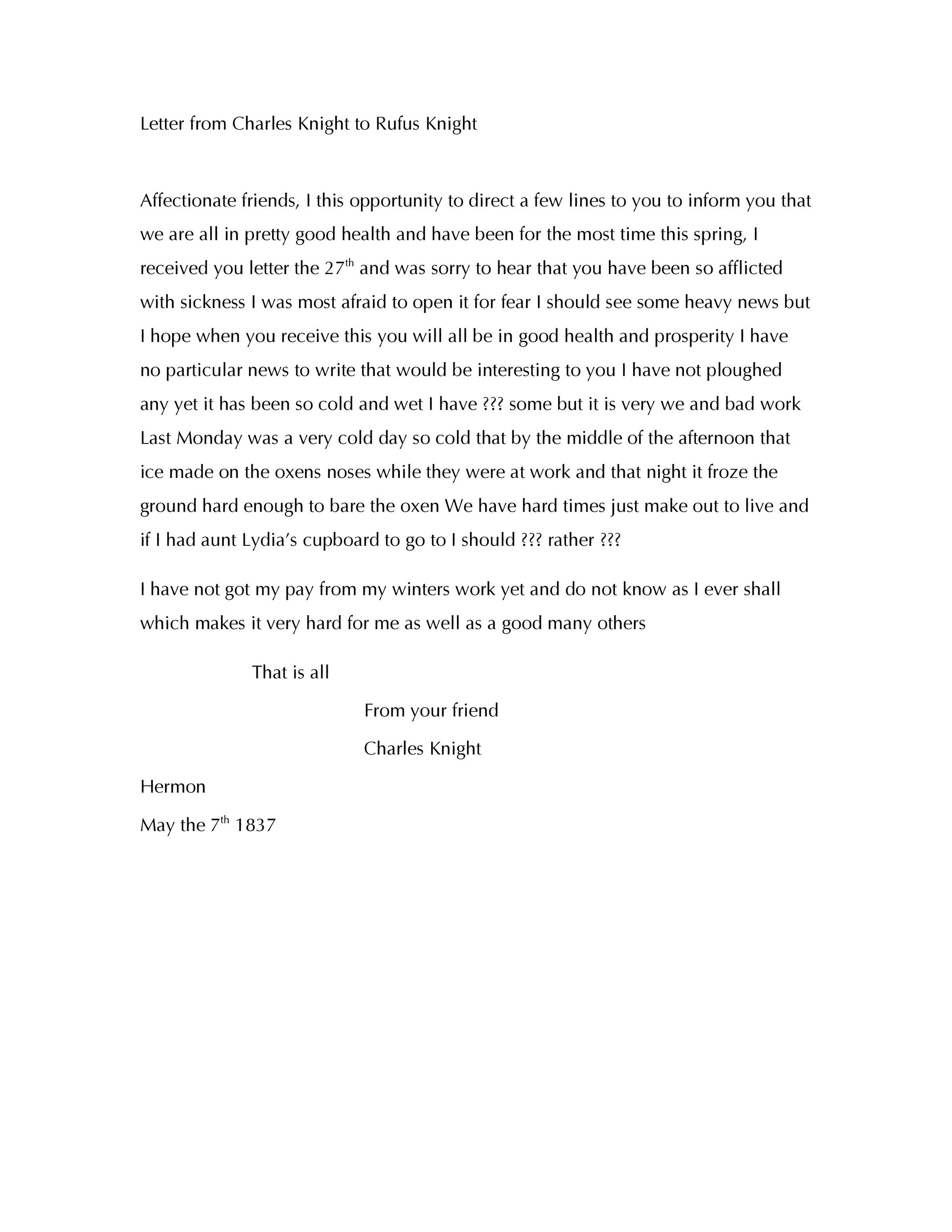 Knight Collection - 1834 Letter; Dated May 7th; Written by Charles Knight to his brother Rufus Knight; Part of letter written by Betsey Knight; Transcription only, original not found with other lettersRelationships