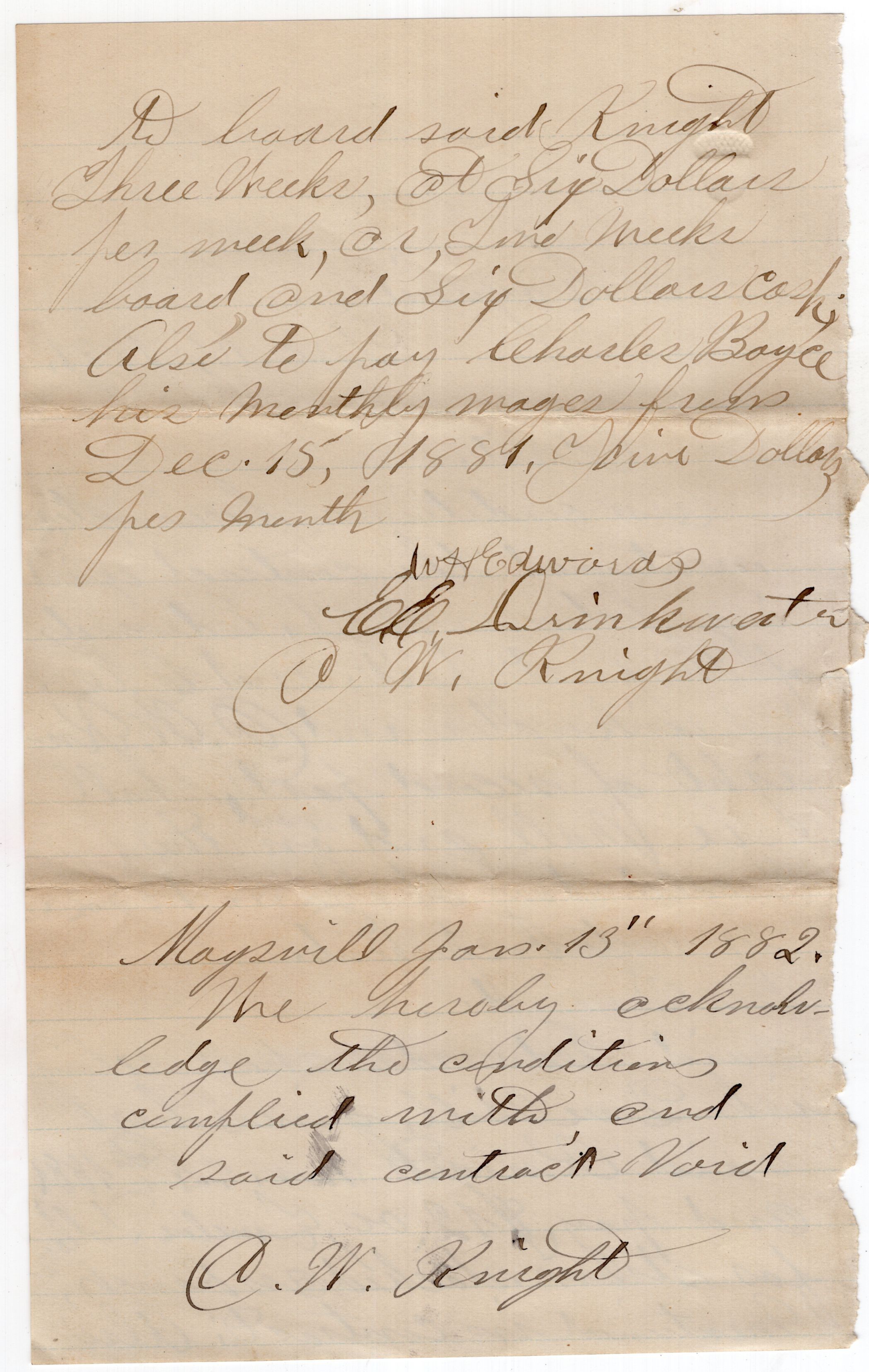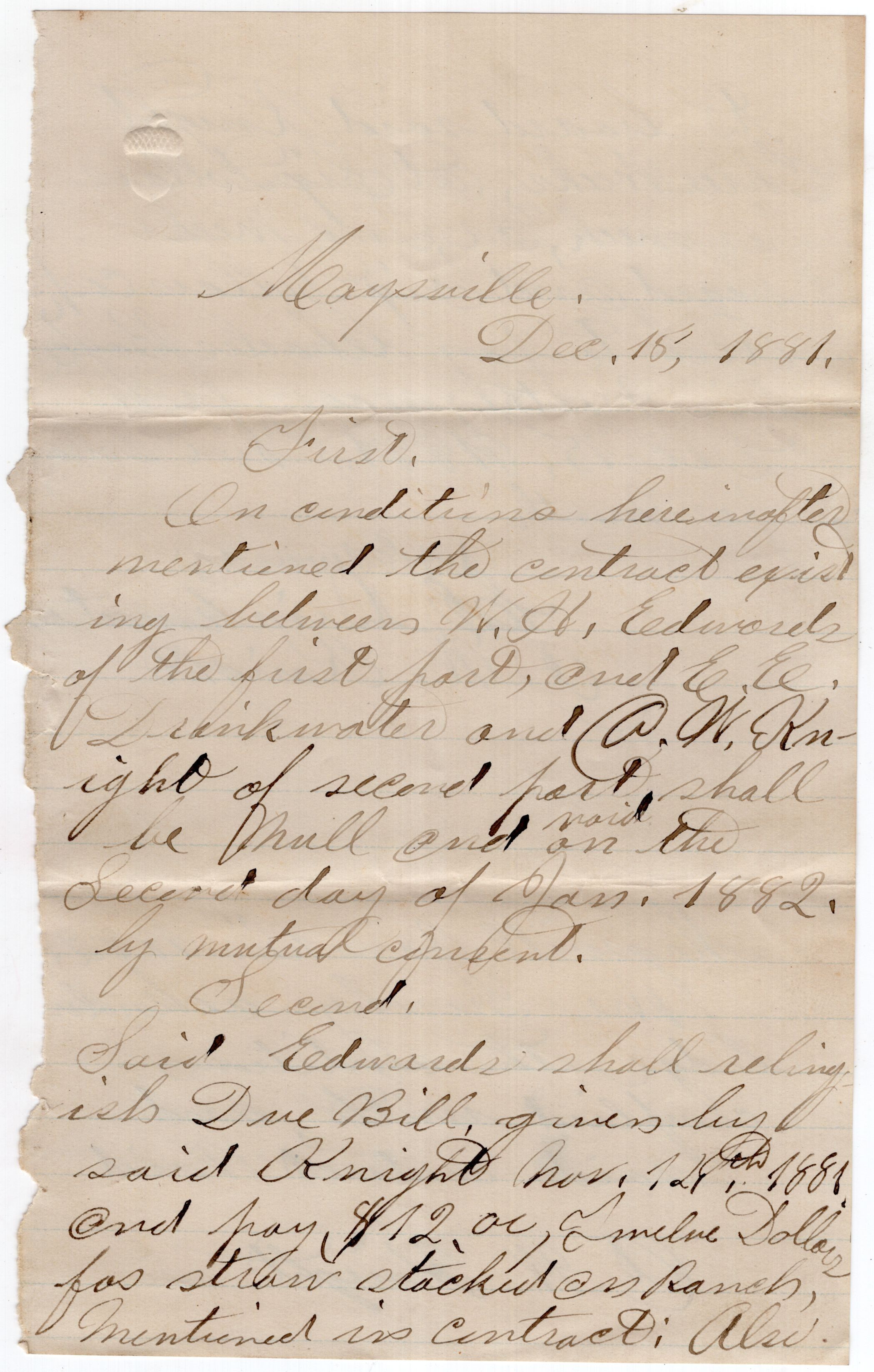 Knight Collection - 1881 Letter; Dated December 15th; Contract written by Arno Knight between W.H. Edwards, Ernest Drinkwater and himself; Ernest is Olive's brotherRelationships