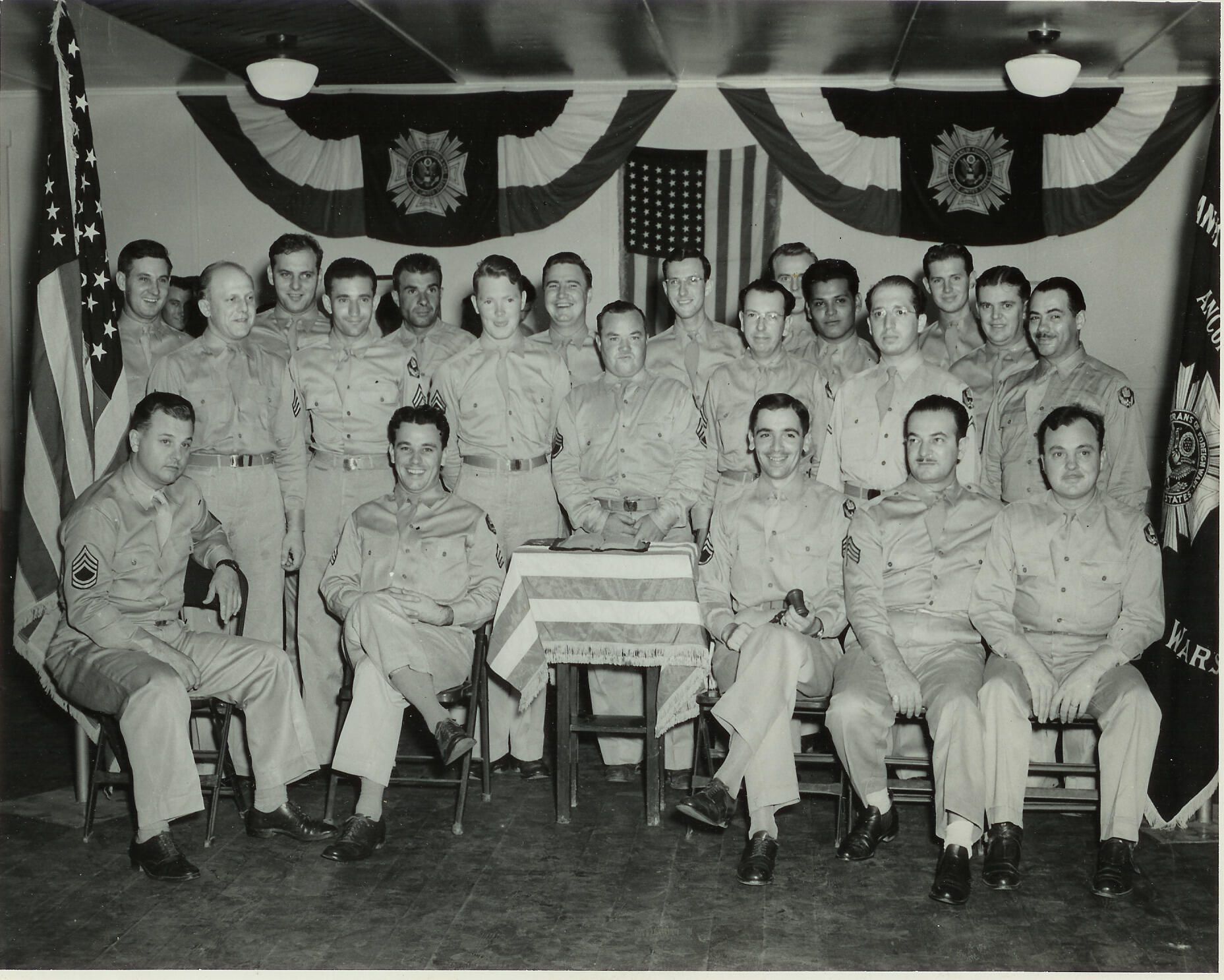 photograph of a group of soldiers sitting as if on a dias with flags flanking and a table with book in front of an apparent speaker; David Nichols, with mustache, is seated to the speaker's left; must be mid to late '40s during D.A.N.'s military service