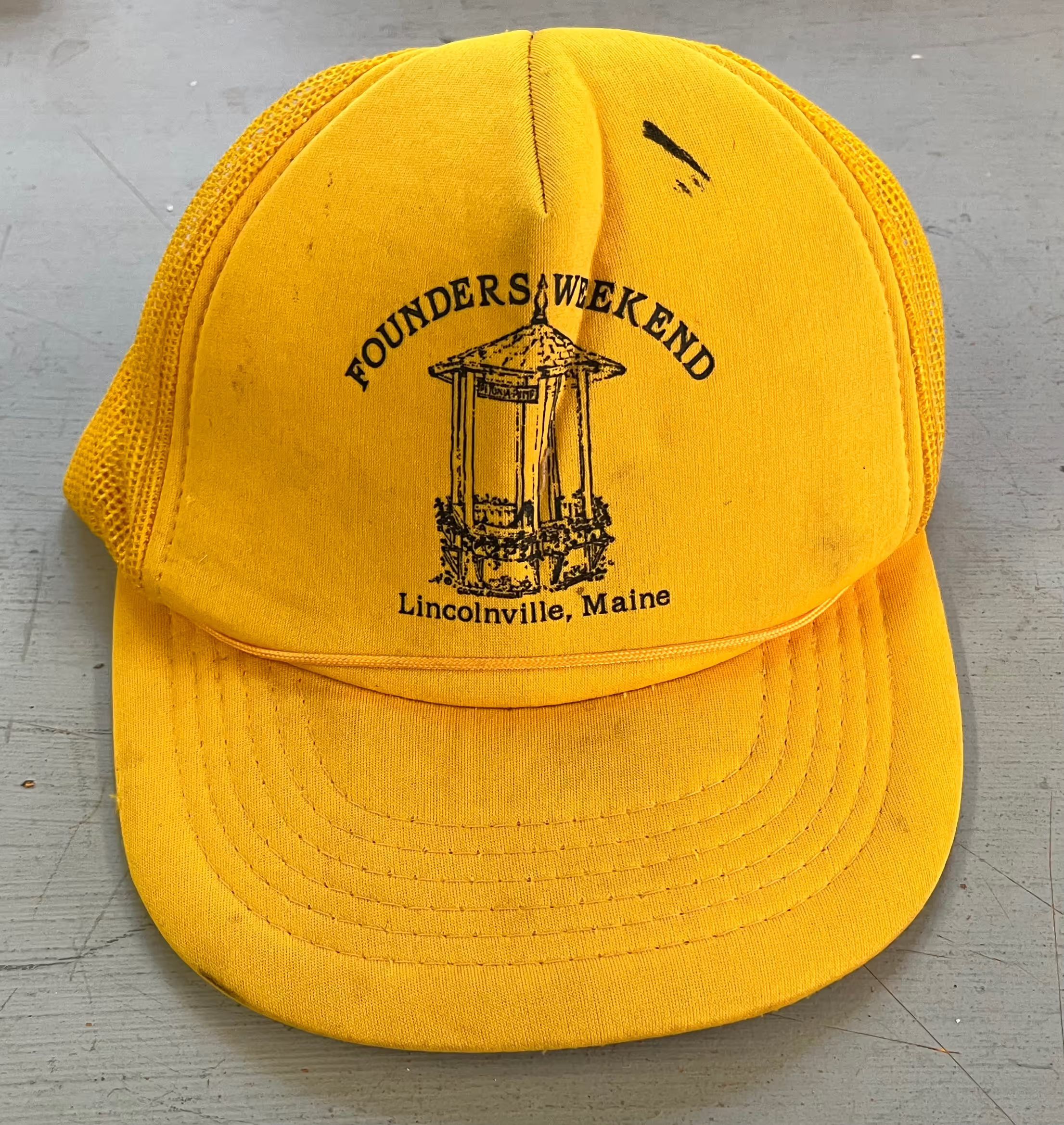 bright yellow ball cap with Founders Week-end Lincolnville Maine logo