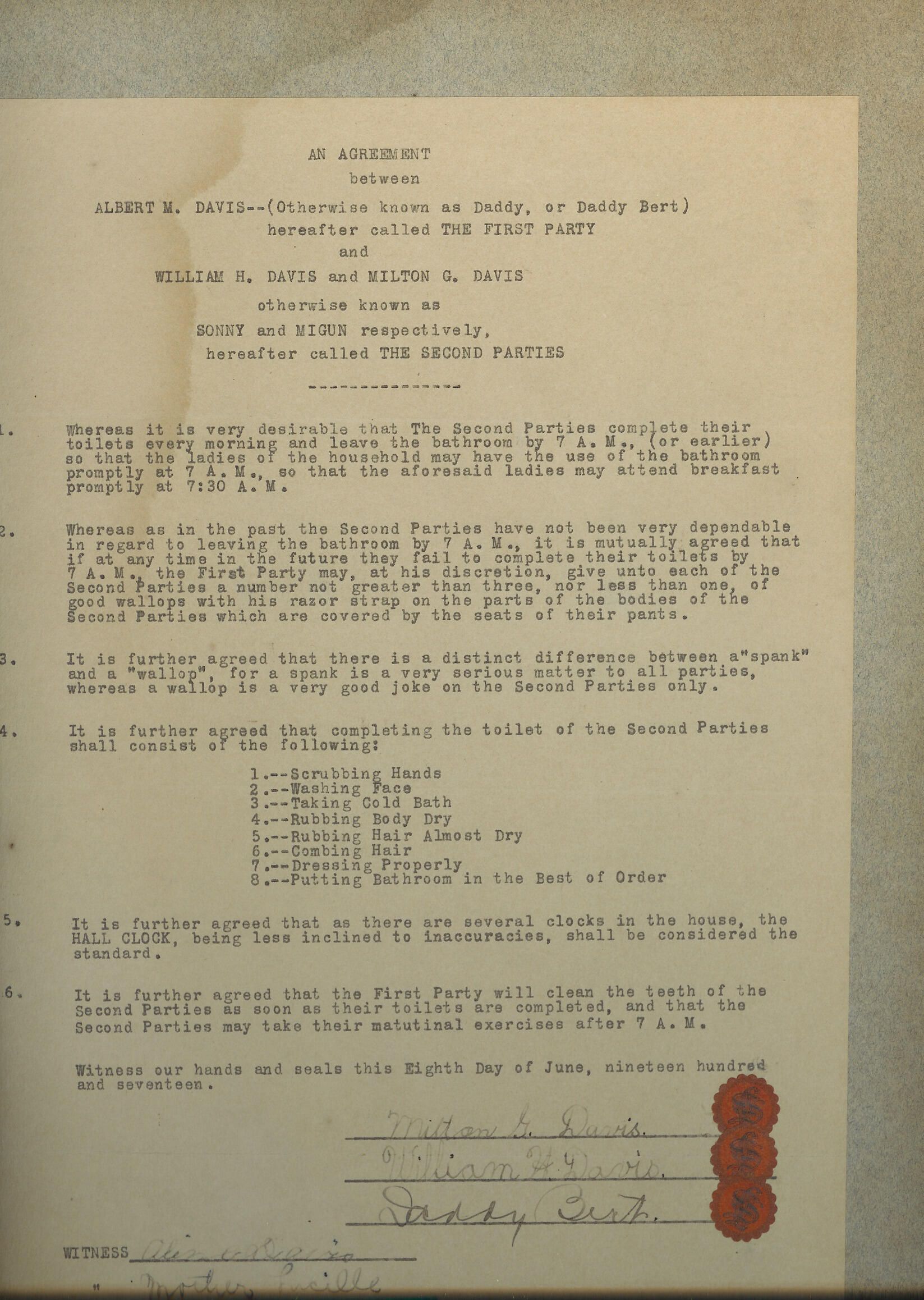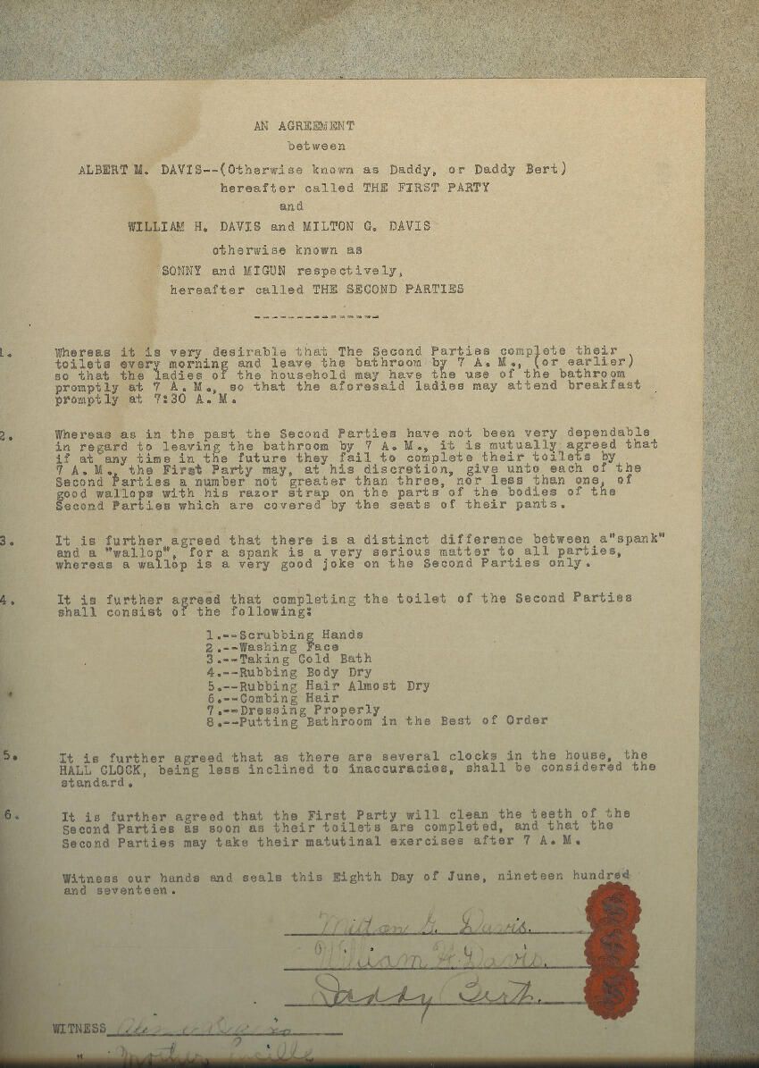 Humorous contract between Bert Davis and his sons Milton and Bill.Relationships