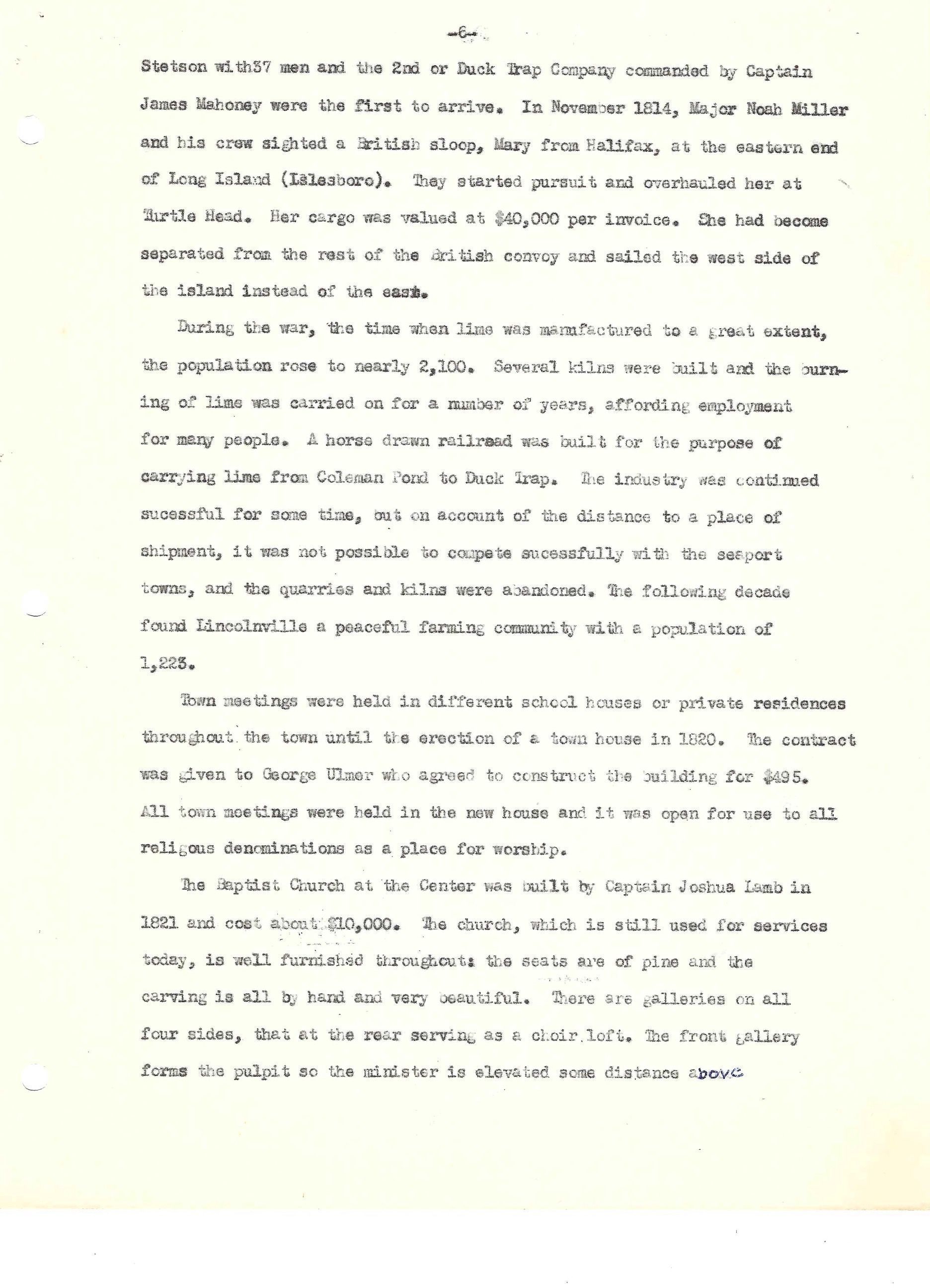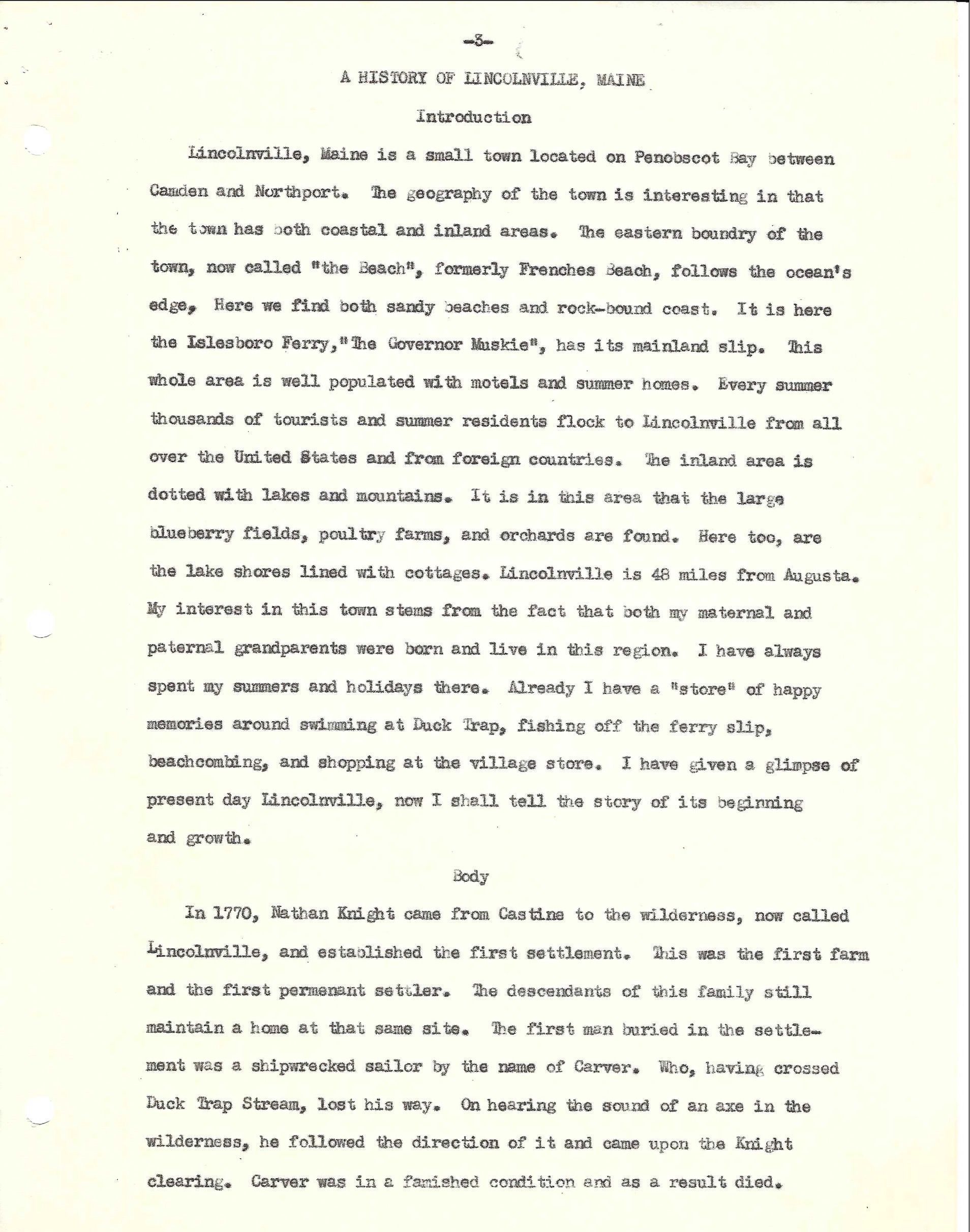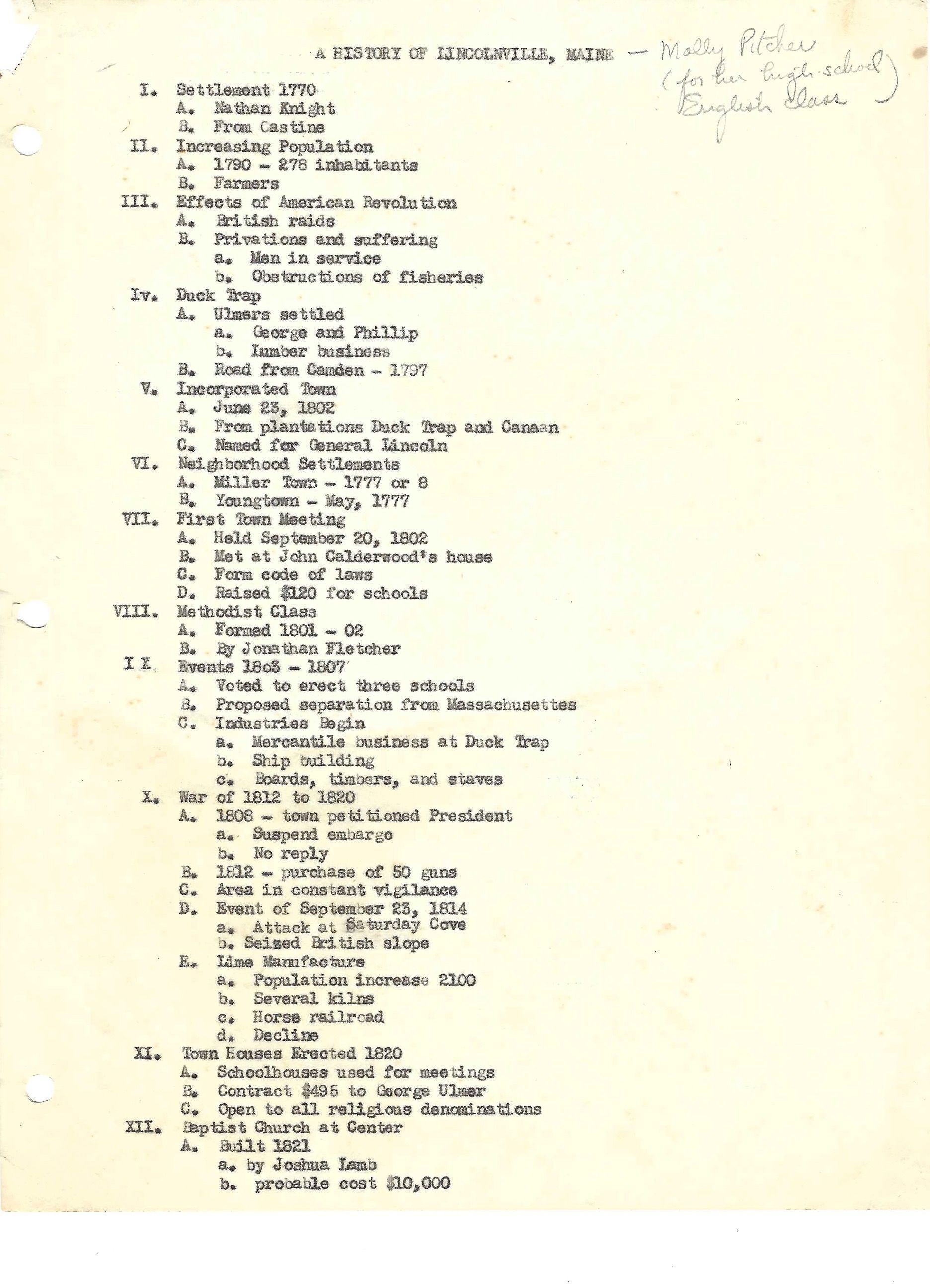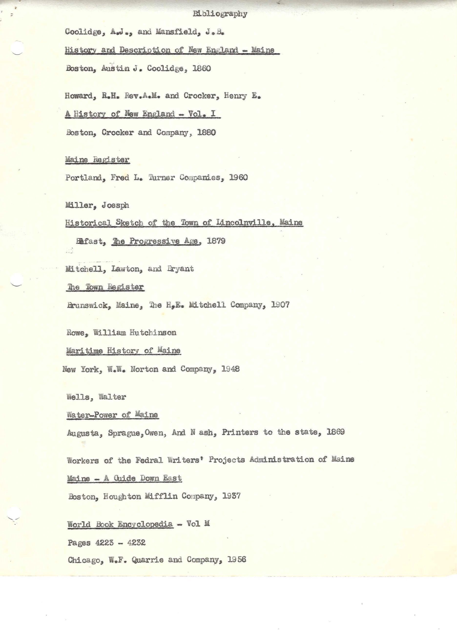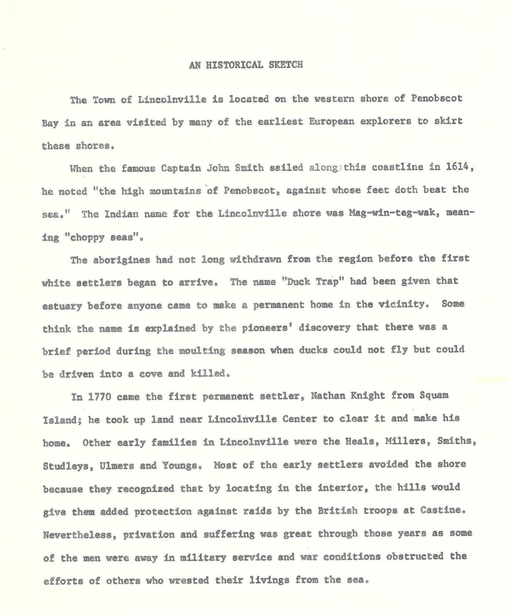 A history of Lincolnville complete with a table of contents, body, bibliography and other incidental information