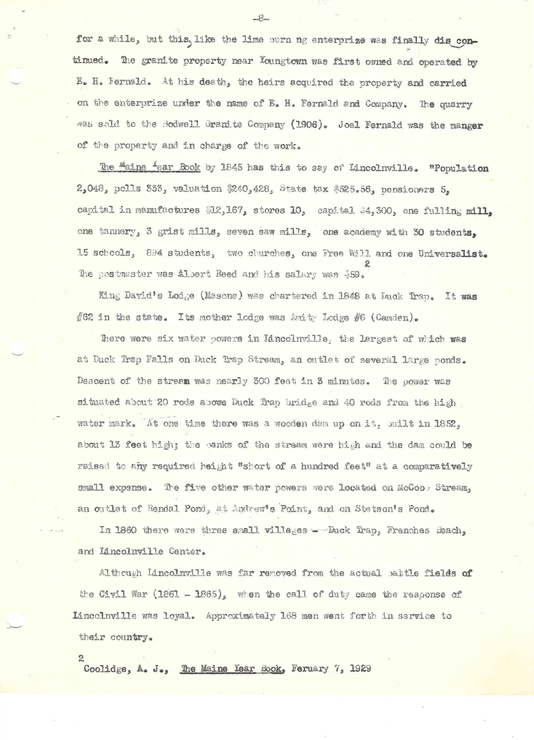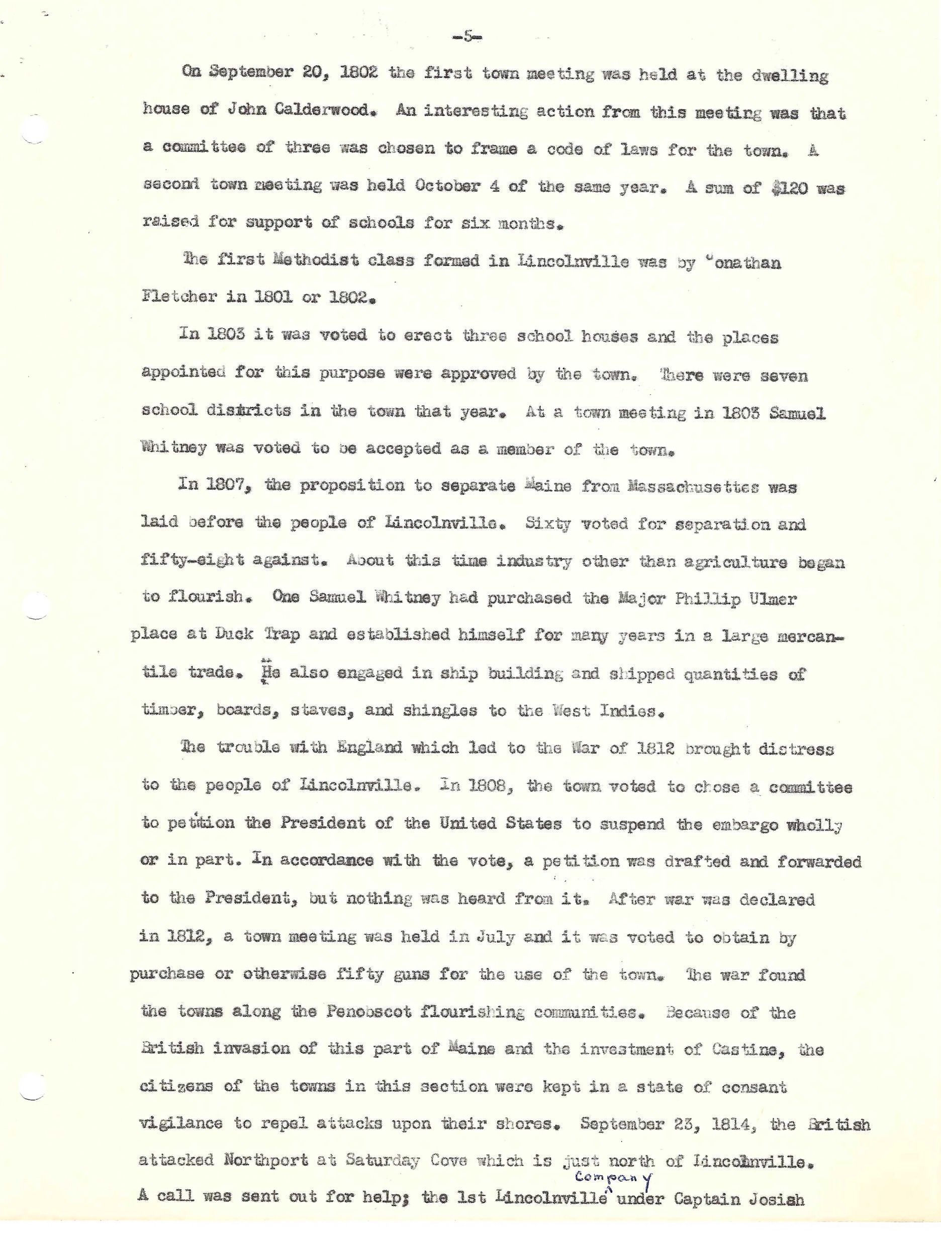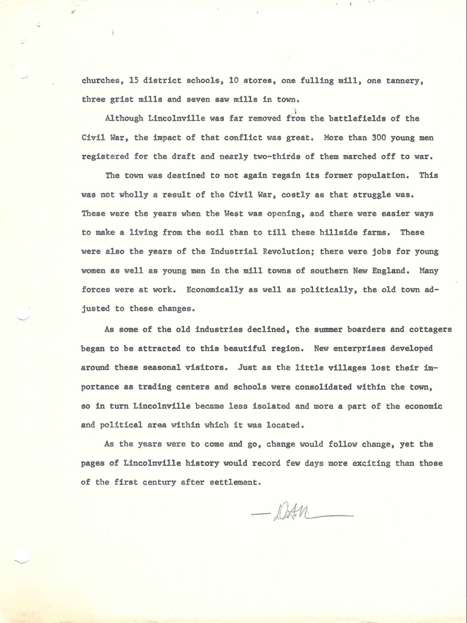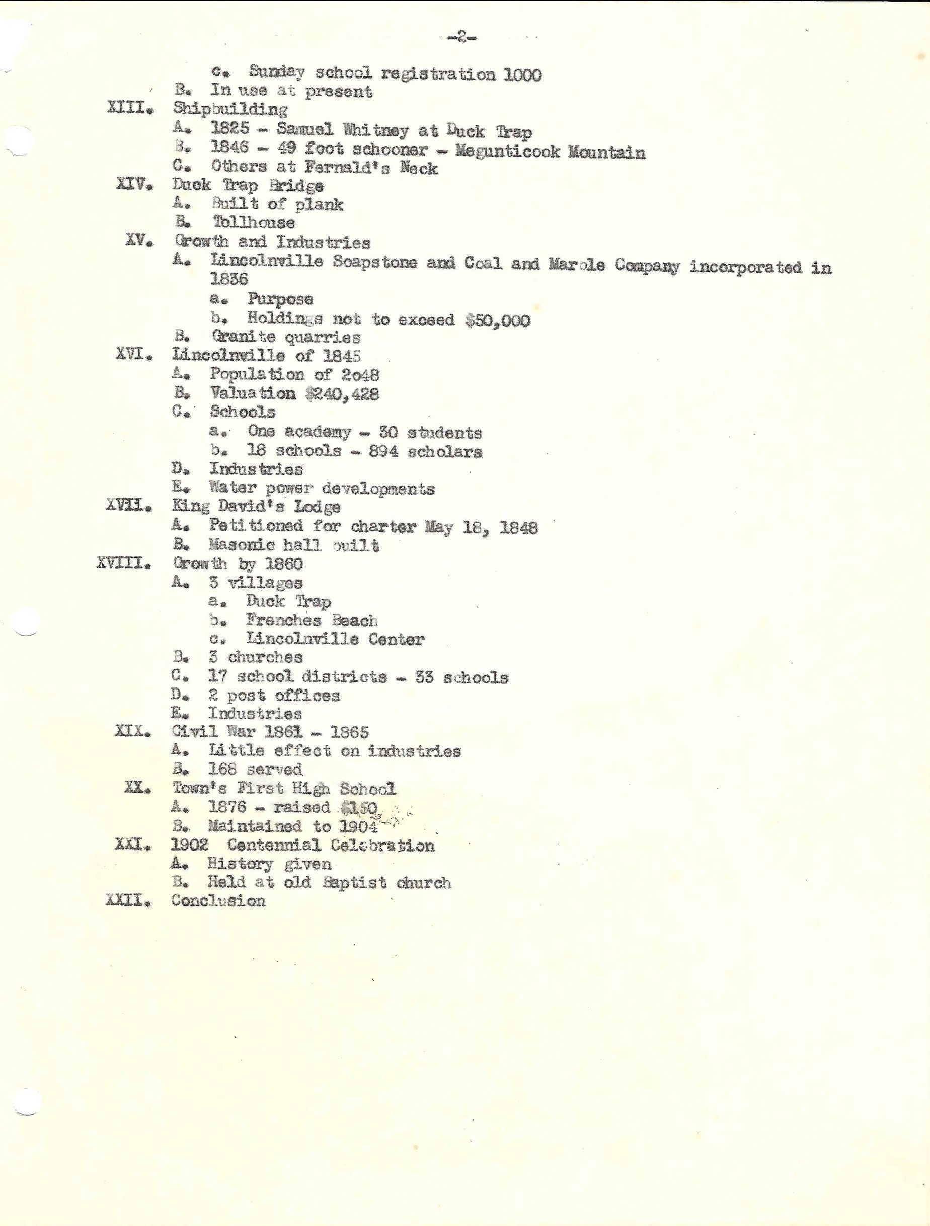 A history of Lincolnville complete with a table of contents, body, bibliography and other incidental information