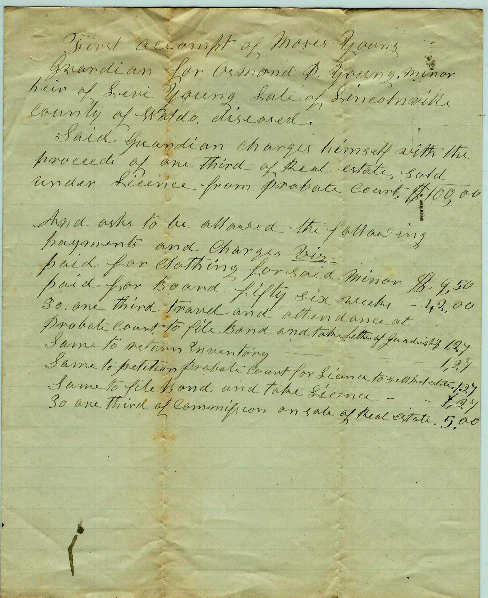Moses Young was appointed legal guardian for Eugene A. Young, Osman P. Young and Rosina M. Young, minor heirs of Levi Young. Levi Young was a private in Company C. of the Third Regiment of Maine Vols. in the War of 1861 . He was taken prisoner at 3d Diasfield Hospital on May 10, 1864 where he died. His widow remarried Phillip Hall.