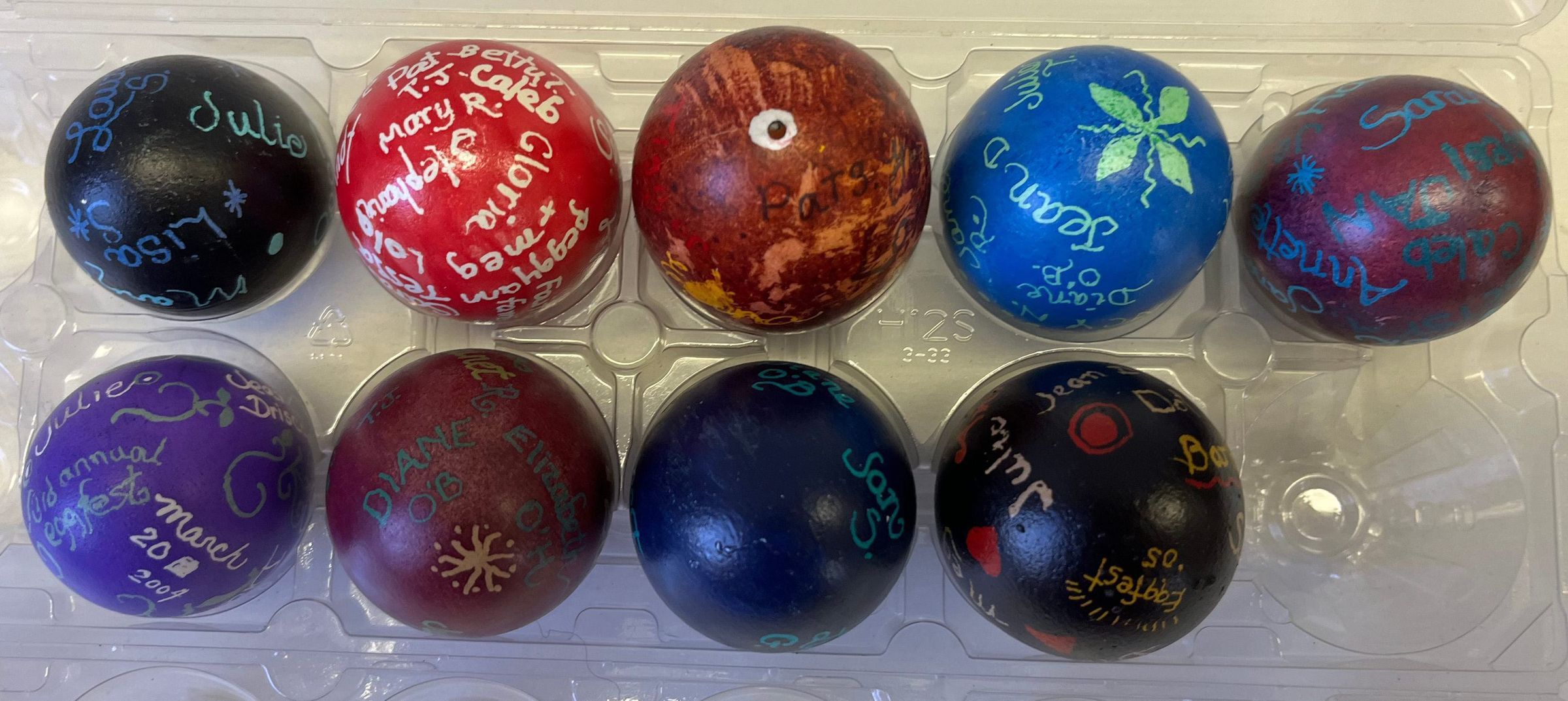 9 eggs decorated at an annual Pysanky egg gathering at the Community Building