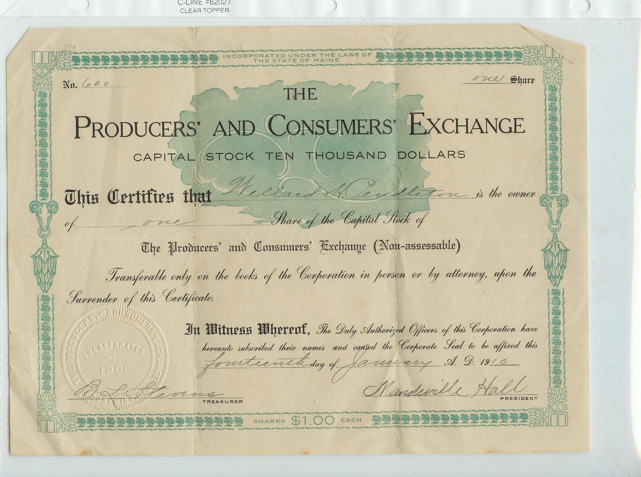 Stock certificate owned by Willard H. Pendleton for one share of capital stock in the Producers' and Consumers' Exchange.