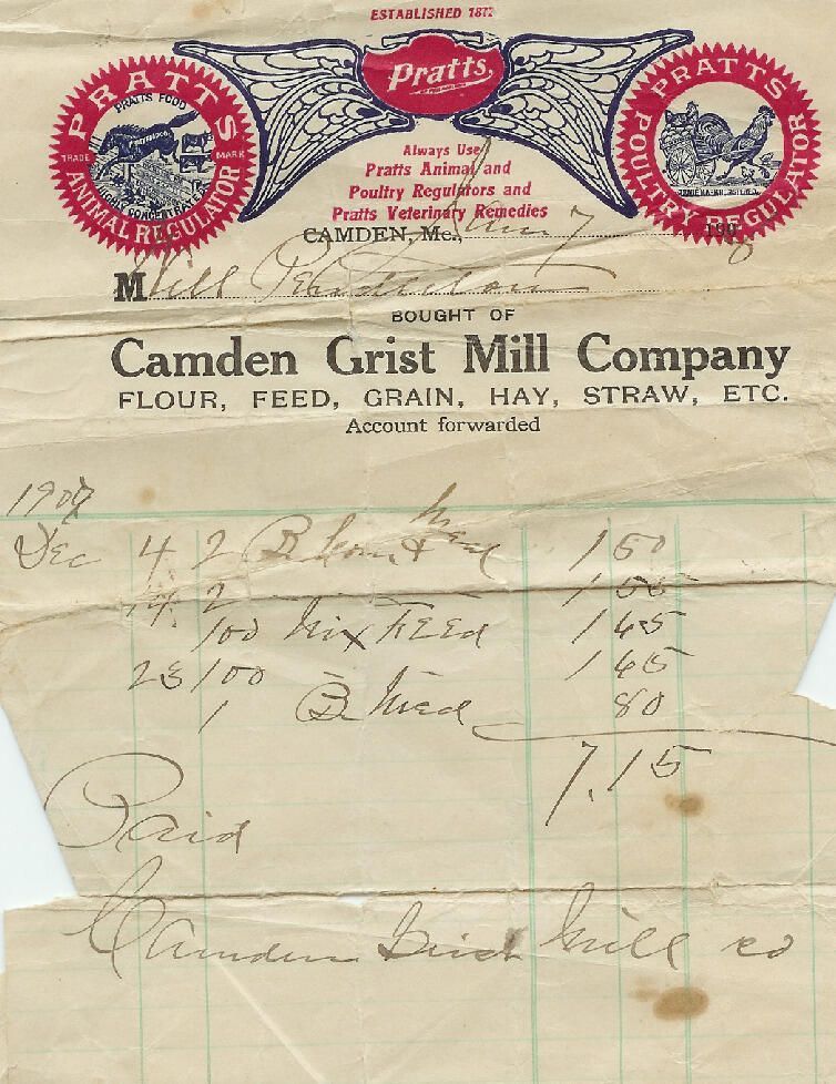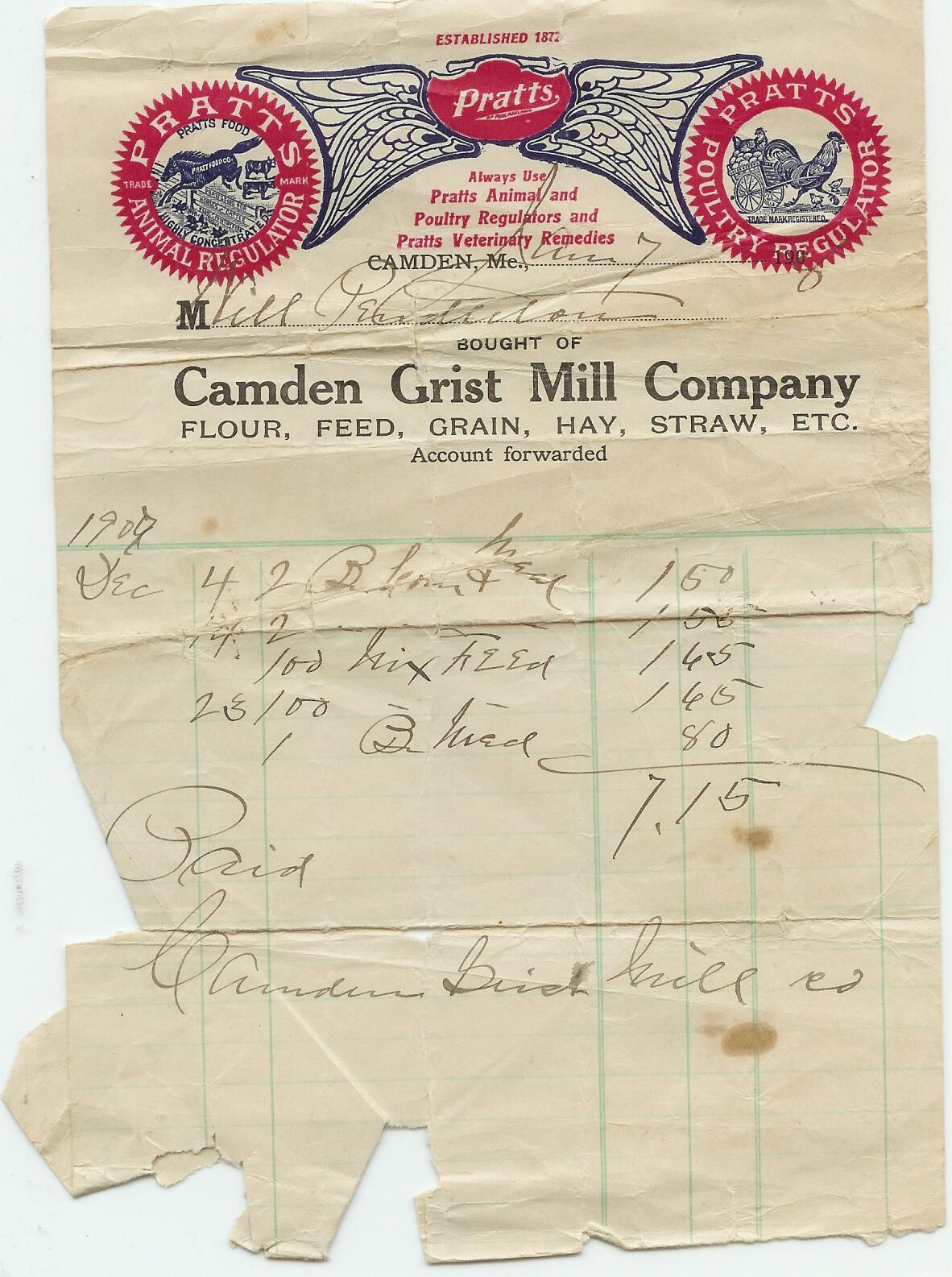Receipt made out to Will Pendleton from Camden Grist Mill Company.