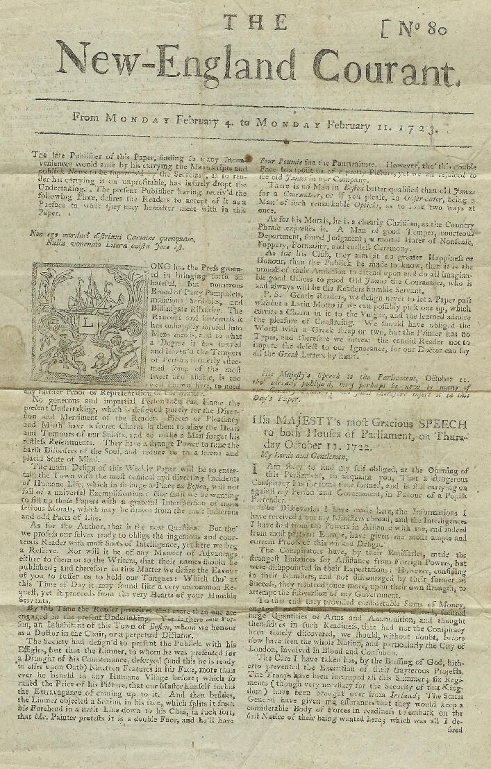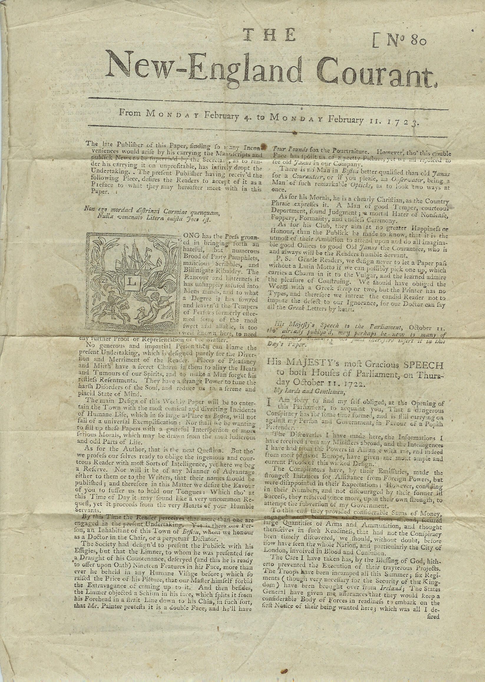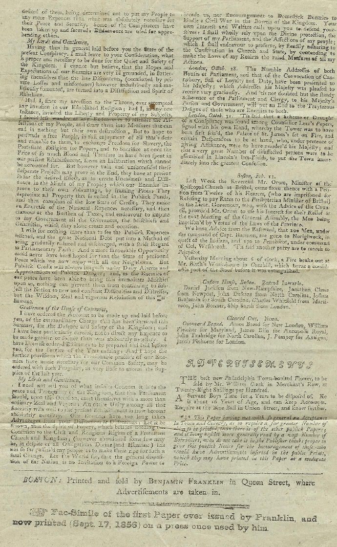 Facsimile of the first paper ever issued by Benjamin Franklin and now printed (Sept. 17, 1856) on a press once used by him. The New-England Courant.