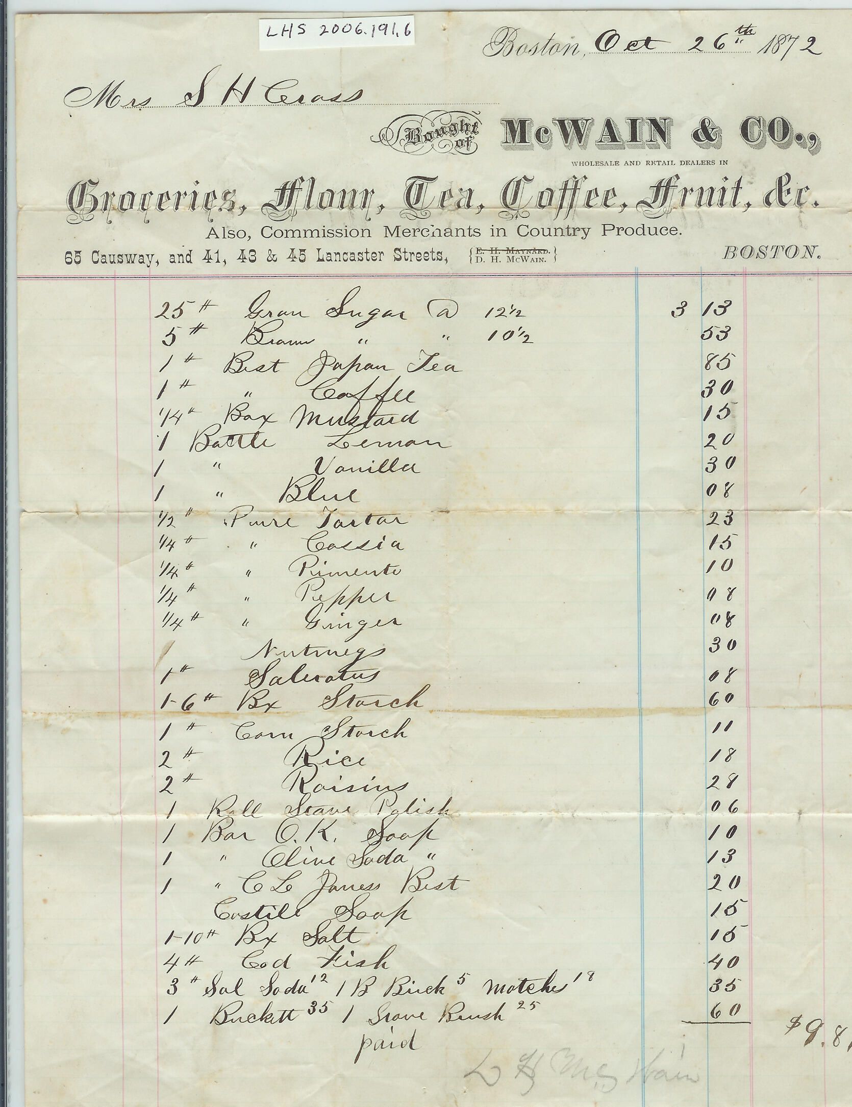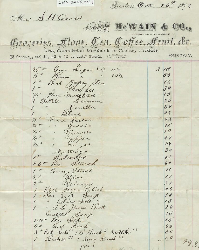 Grocery receipt from McWain and Company, Boston, MA to S. H. Cross