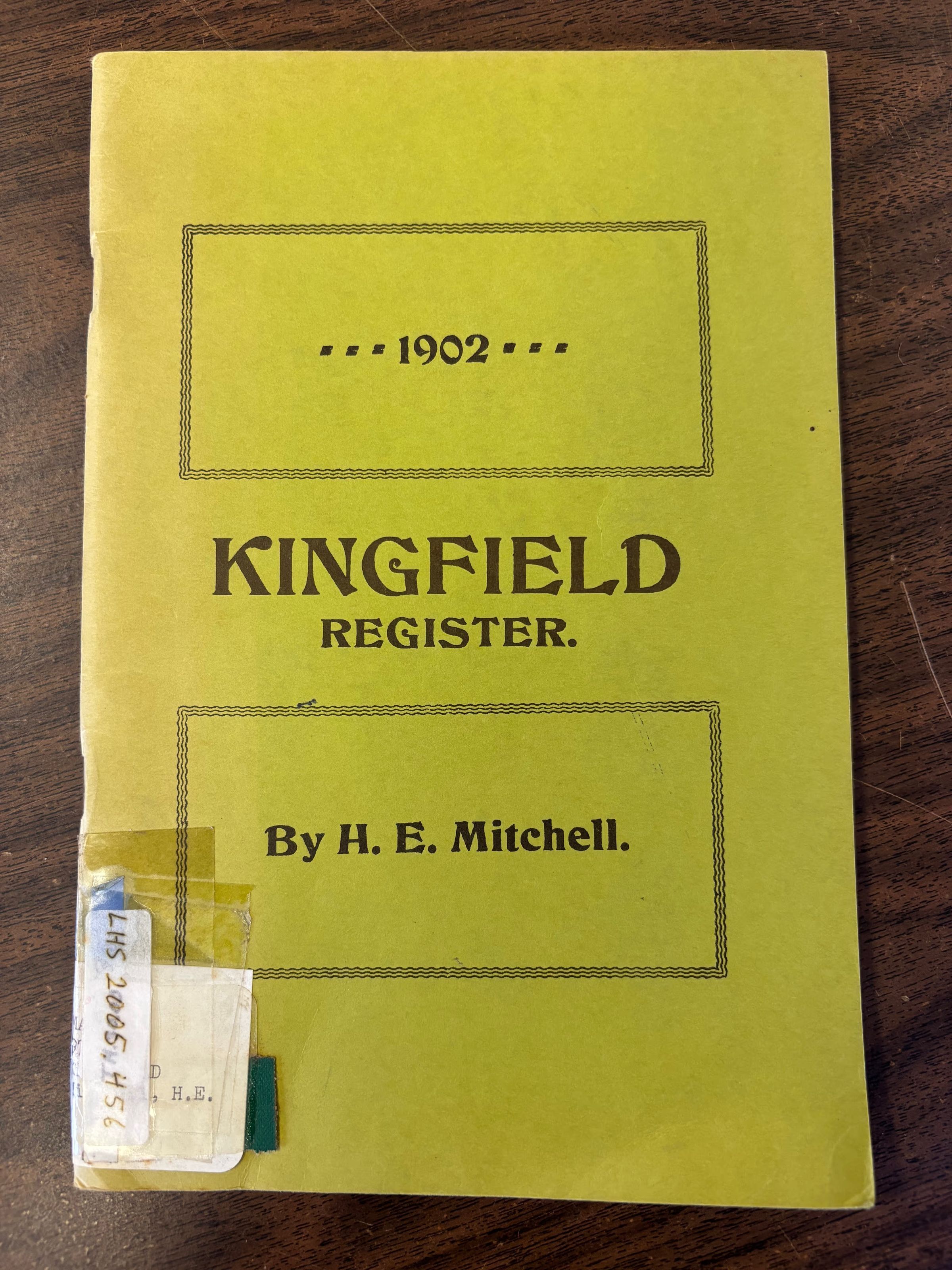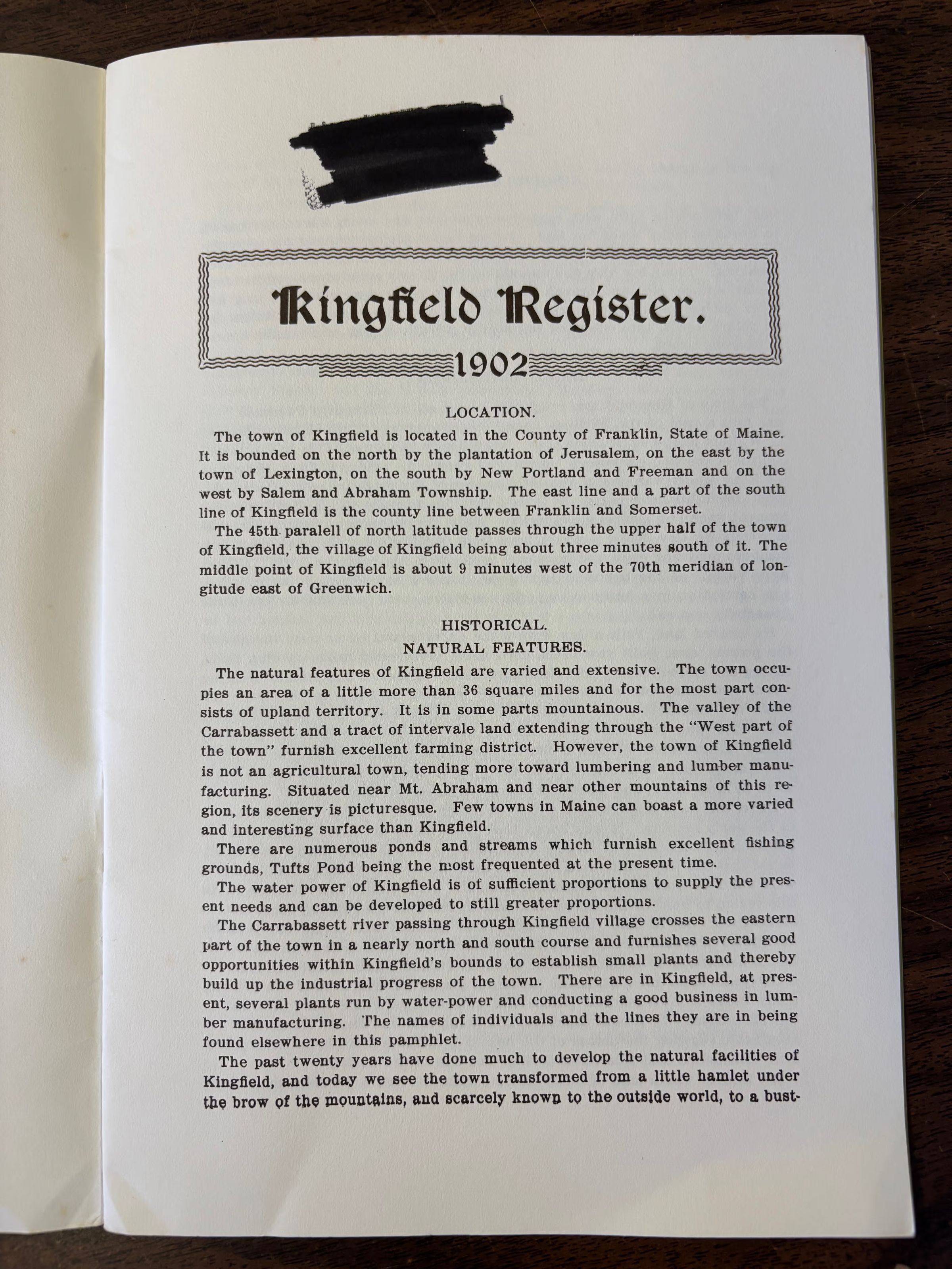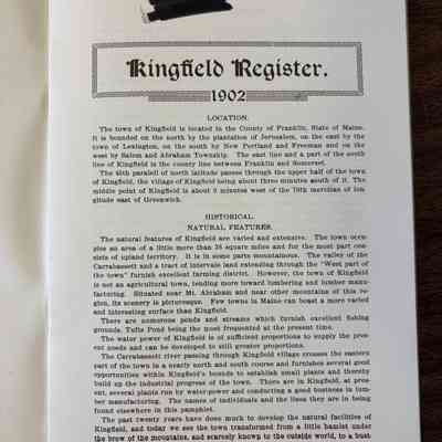 Soft cover book containing town history, military matters, records of deaths 1892 - 1902, census, etc. of Kingfield, Maine.