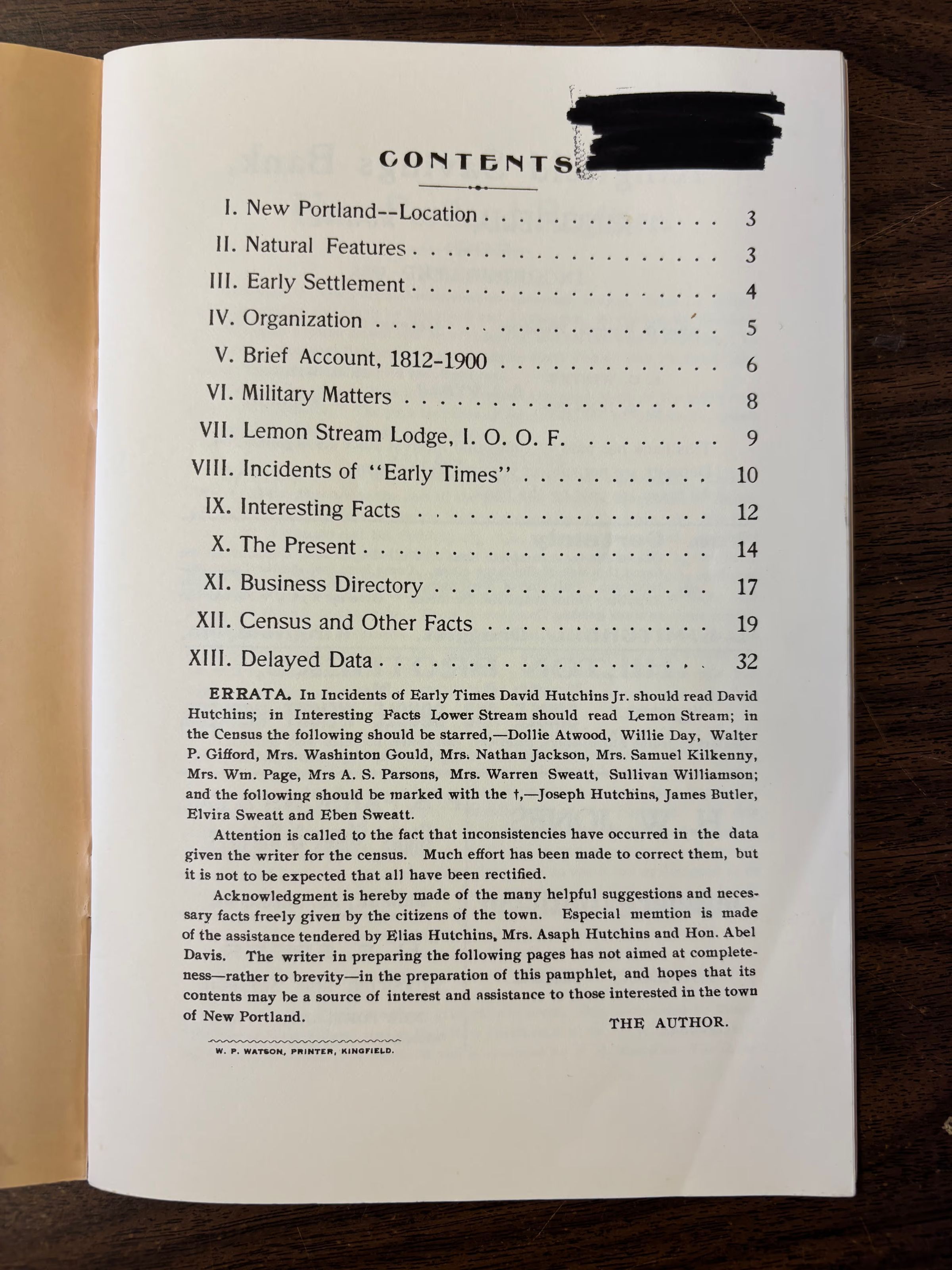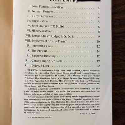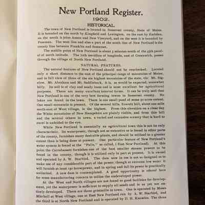 Soft cover book containing history, natural resources, census, business directory, etc. of New Portland, Maine. Approx. 38 pages.