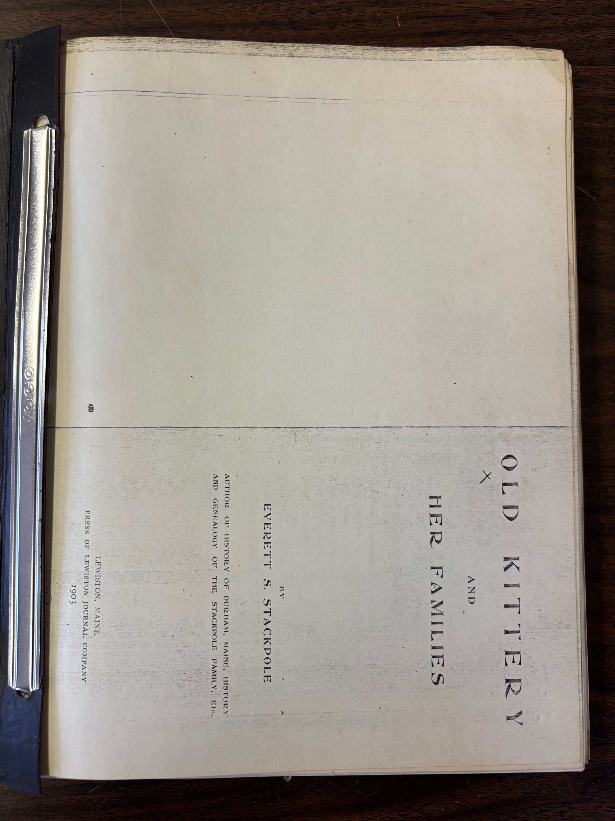 Photocopied book containing 865 pages, indexed, of history, geneaologies, Navy Yard history, etc. of Kittery , Maine and her Families
