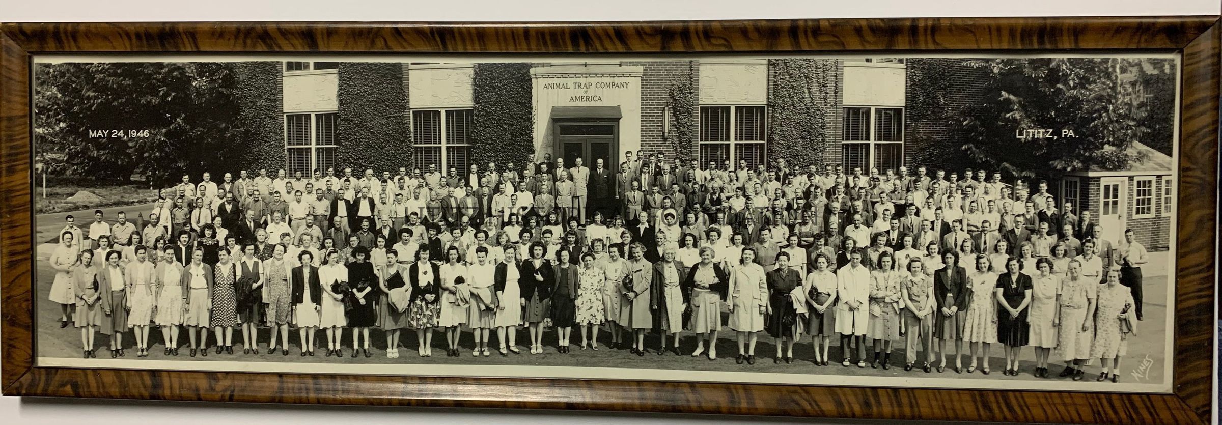 Black and white photograph of Animal Trap Employees, Lititz, PA May 24, 1946Photograph Details