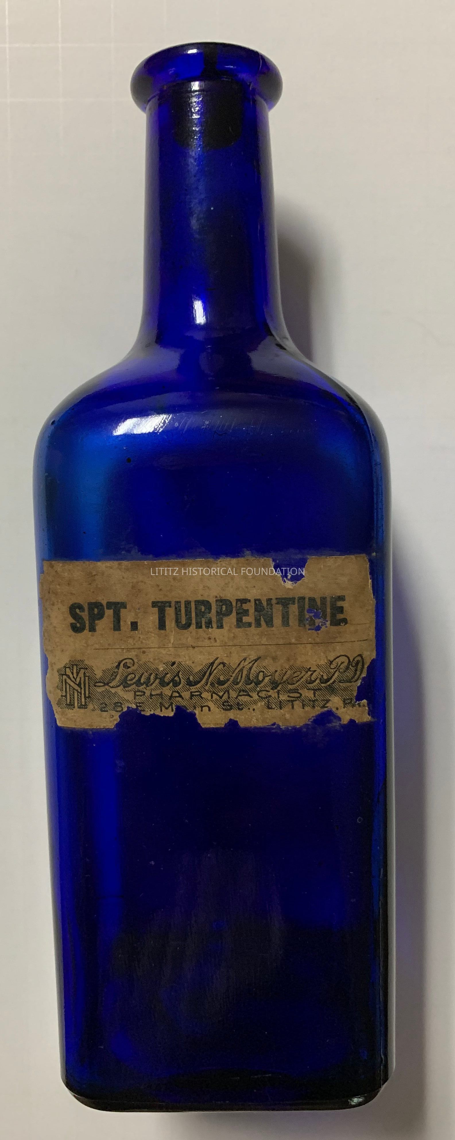 Apothecary bottle for Spirits of Turpentine from Lewis N. Moyer pharmacy, ca. 1900-1920.Made/Created