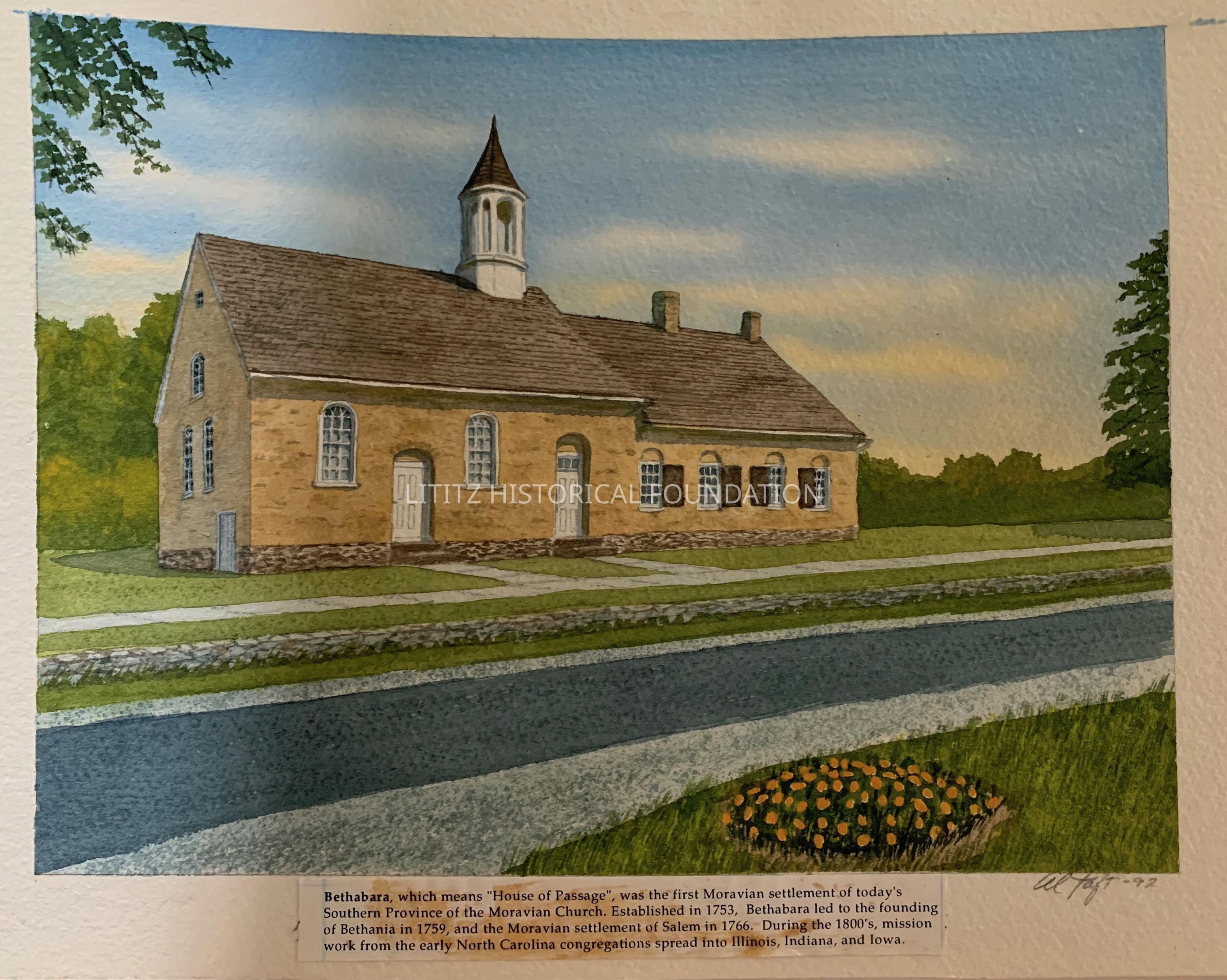 Bethabara, which means "House of Passage", was the first Moravian settlement of today's Southern Province of the Moravian Church. Established in 1753, Betharaba led to the founding of Bethania in 1759, and the Moravian settlement of Salem in 1766. During the 1800's, mission work from the early North Carolina congregations spread into Illinois, Indiana, and Iowa.Artwork Details