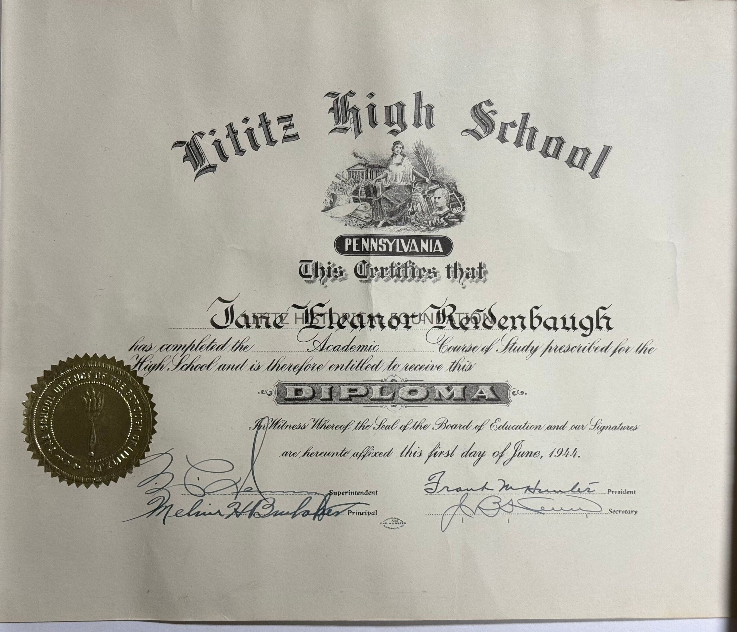 Diploma for Jane Reidenbaugh, June 1, 1944Collection